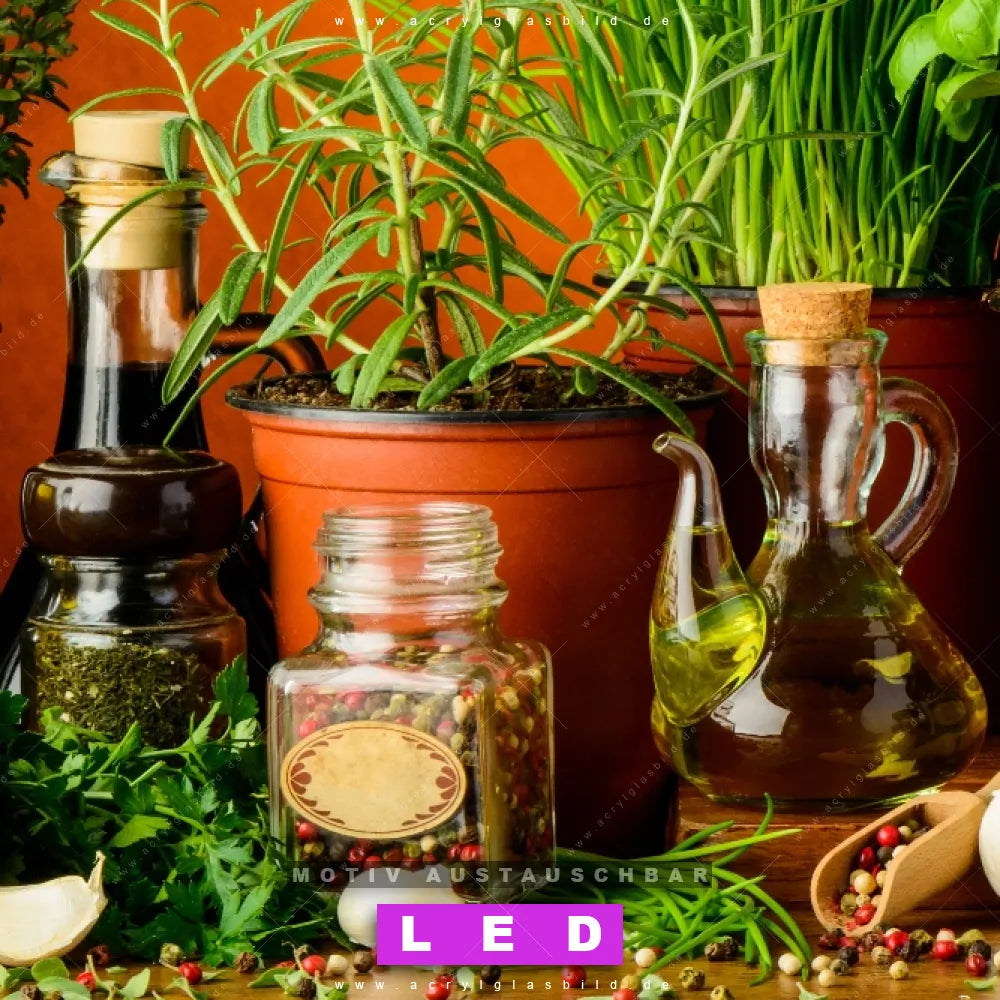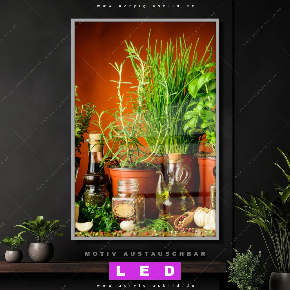 Du suchst nach einem Wandbild mit LED Beleuchtung als ultimativen Hingucker für deine Wände? Dann haben wir das perfekte dimmbare LED Bild mit Fernbedienung und optionaler Farbtemperatursteuerung für dich: unser abgefahrenes Essen - Trinken Canvalight® DIA LED Acrylglasbild! Mit dem LED Leuchtbild aus Acrylglas Stillleben mit mediterranen Kräutern im Hochformat mit austauschbarer bedruckter Acrylglas-Scheibe bringst du nicht nur Licht, sondern auch ordentlich Stil in deine Bude.
