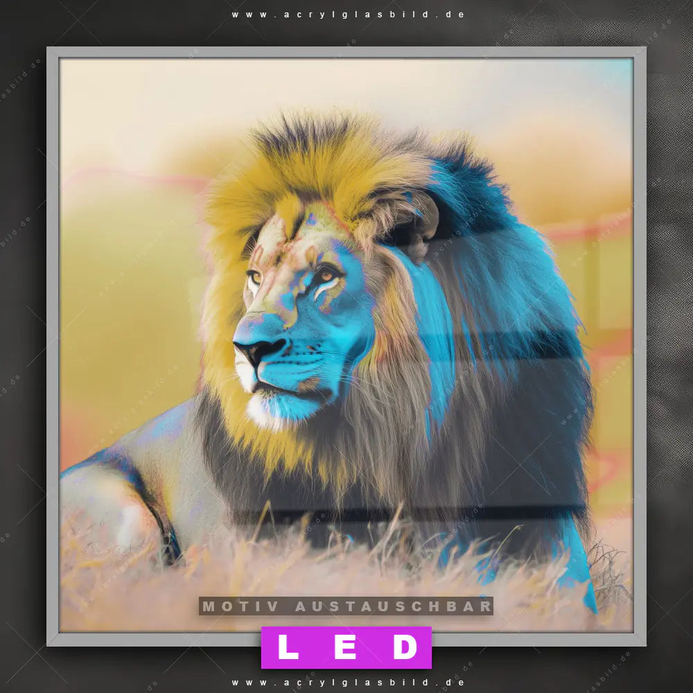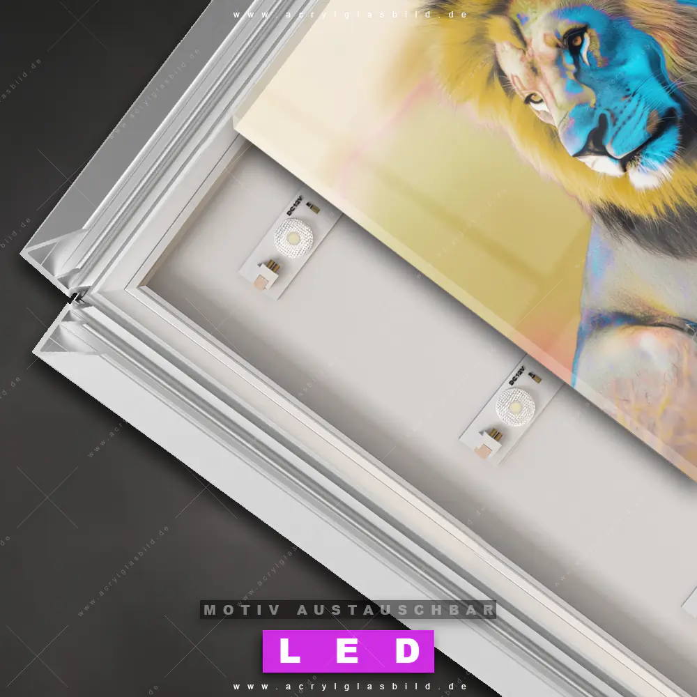 Also, worauf wartest du noch? Gib mit einem beleuchteten Wandbild mit wechselbarer Acrylglas-Scheibe deinen Wänden das gewisse Etwas und bestelle jetzt das LED Acrylglasbild Canvalight® DIA Buntes Tierreich - Der Löwe – dein Zuhause wird es dir danken und deine Freunde werden dank der wechselbaren Motive erblassen!