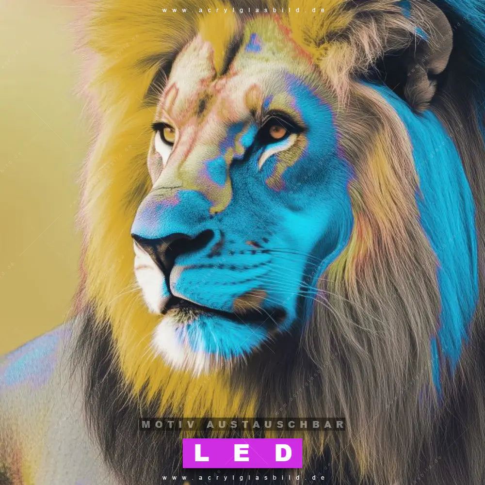 Vergiss dunkle Ecken und Langeweile! Mit unserem Acrylglasbild Löwe im Farbenrausch und seiner brillanten LED-Ausleuchtung wirst du dich nie wieder in der Dunkelheit verirren. Wenn du auf der Suche nach einem beleuchteten Wandbild aus Acrylglas mit Raubkatze, Löwe, Afrika, Lion, Farbe, Tierporträt, Natur, Freiheit, Safarie bist, ist unser LED Acrylglasbild Canvalight® DIA Bunter Löwe - Kunst der Natur mit den strahlenden Motiv-Farben Blau, Beige, Gelb , Braun genau das richtige Leuchtbild für dich. Das im Modern Art, Pop Art Stil gestaltete LED Bild mit glänzender Front aus Acrylglas passt perfekt zu jedem Einrichtungsstil in Wohnzimmer - Schlafzimmer, Flur - Eingangsbereich, Büro - Kanzlei – vom minimalistischen Chic bis zum kreativen Chaos.