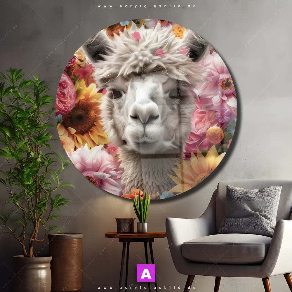 Hey du! Bist du es auch leid, auf langweilige, weiße Wände in deinem Raum zu starren und dich zu fragen, ob das der Sinn des Lebens ist? Unser Acrylglasbild mit dem Titel Alpaka mit Blumen im Format Rund verwandelt deine Wand in ein Kunstwerk und macht deinen Raum zum absoluten Hingucker.