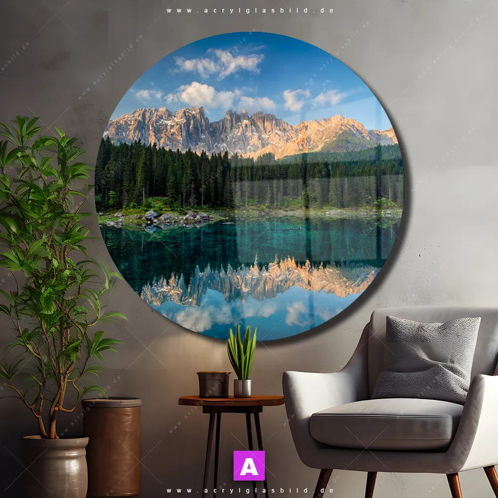 Hey du! Bist du es auch leid, auf langweilige, weiße Wände in deinem Raum zu starren und dich zu fragen, ob das der Sinn des Lebens ist? Unser Acrylglasbild mit dem Titel Bergsee im Wald im Format Rund verwandelt deine Wand in ein Kunstwerk und macht deinen Raum zum absoluten Hingucker.