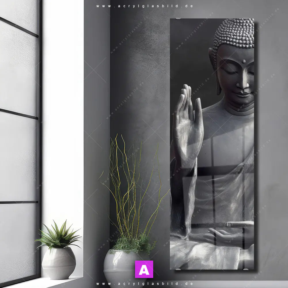<b>Produktart:</b> Acrylglasbild | Glasbild | Wandbild aus Kunstglas | <b> Motiv:</b> Buddha - Erleuchtung im Dunkeln | <b> Bildausrichtung:</b> Schmal | <b> Max. Motiv-Größe:</b> 410cm breit | 275cm hoch | <b> Verfügbare Formate: </b> Quadrat, Querformat, Hochformat, Panorama, Schmal, Rund | <b> Kategorie:</b> Buddha - Feng Shui | <b> Farben:</b> Weiss, Schwarz, Grau | <b> Kunstformen:</b> Digitale Kunst | <b> Kunststile:</b> Modern Art, Schwarz - Weiss