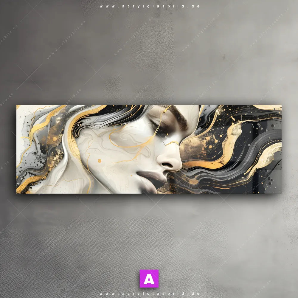 <b>Produktart:</b> Acrylglasbild | Glasbild | Wandbild aus Kunstglas | <b> Motiv:</b> Elegantes gold-schwarzes Porträt | <b> Bildausrichtung:</b> Panorama | <b> Max. Motiv-Größe:</b> 240cm breit | 240cm hoch | <b> Verfügbare Formate: </b> Quadrat, Querformat, Hochformat, Panorama, Schmal, Rund | <b> Kategorie:</b> Porträts - Menschen, Muster - Texturen | <b> Farben:</b> Weiss, Schwarz, Gold | <b> Kunstformen:</b> Digitale Kunst, Kunst - Malerei | <b> Kunststile:</b> Abstrakt, Modern Art