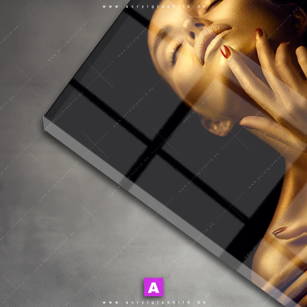 Das Motiv Golden Skin wird im UV-Direktdruck in den Farben Gold, Schwarz auf die Rückseite einer 5mm starken, transparenten Acrylglasplatte gedruckt. Das durchscheinende Motiv Goldfrau im Modern Art Stil wird anschließend vollflächig mit einer weißen Schicht hinterlegt. Das Porträts - Menschen Acrylglasbild | Quadrat erhält so eine bemerkenswerte Farbbrillanz, hohe Schärfe und erstaunliche Tiefenwirkung.