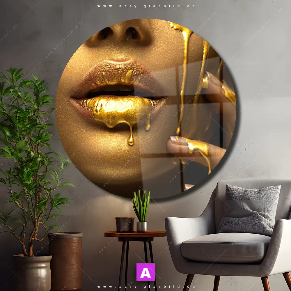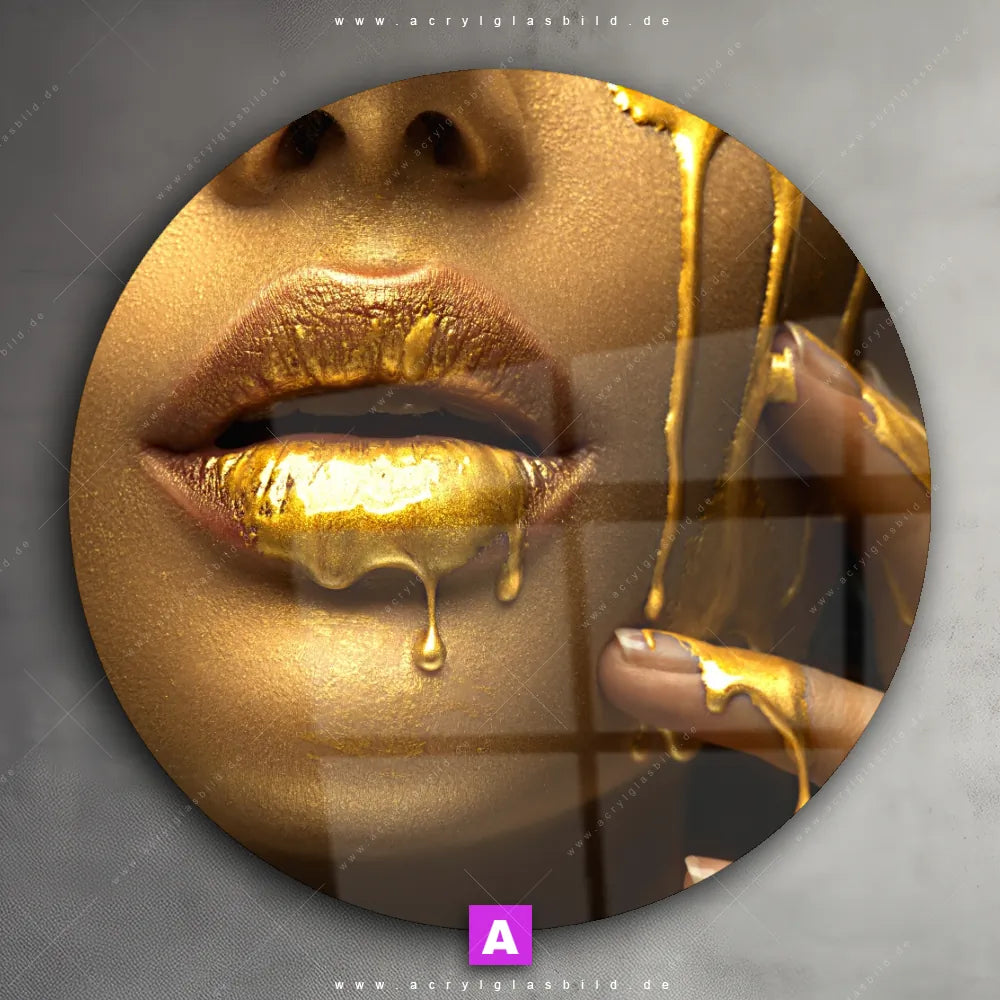 Hey du! Bist du es auch leid, auf langweilige, weiße Wände in deinem Raum zu starren und dich zu fragen, ob das der Sinn des Lebens ist? Unser Acrylglasbild mit dem Titel Goldene Lippen im Format Rund verwandelt deine Wand in ein Kunstwerk und macht deinen Raum zum absoluten Hingucker.