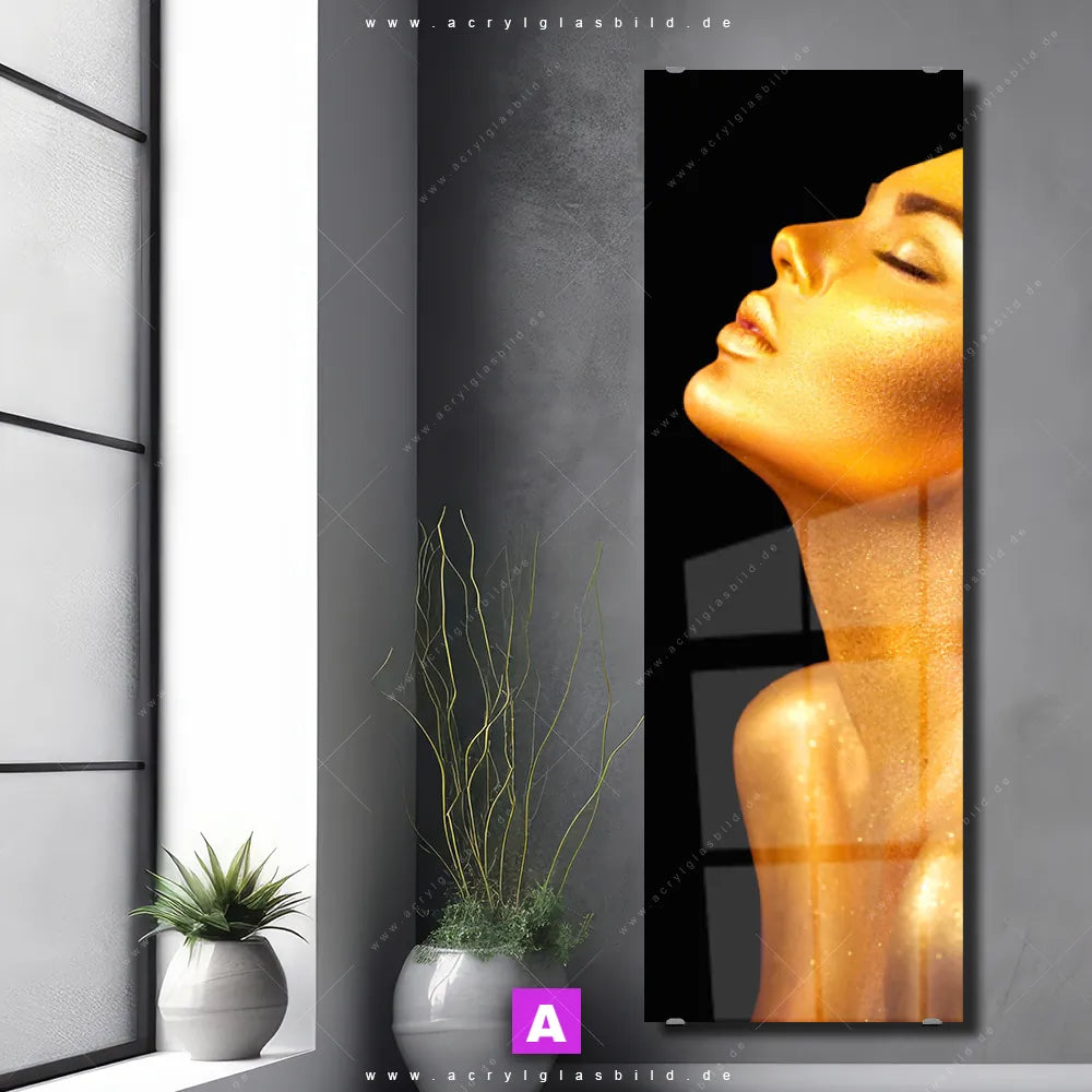 Die einzigartigen Farben in Gold, Schwarz machen das Acrylglasbild Goldfrau mit Frau, Porträt, Erotik, modern, Gold, Farbe, Beauty, Haar, Gesicht, Körper zu einem echten Hingucker. Egal ob deine Einrichtung minimalistisch, modern oder doch eher wild und ausgefallen ist - unser Acrylglasbild Frau mit goldigem Haar im Modern Art Stil passt immer, auch in Friseur - Beauty, Flur - Eingangsbereich, Wohnzimmer - Schlafzimmer.