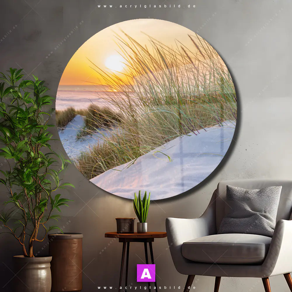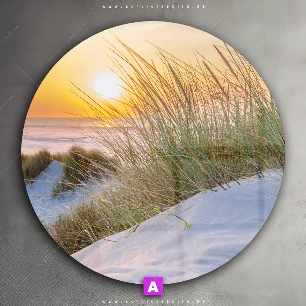 <b>Produktart:</b> Acrylglasbild | Glasbild | Wandbild aus Kunstglas | <b> Motiv:</b> Goldenes Licht über Sanddünen | <b> Bildausrichtung:</b> Rund | <b> Max. Motiv-Größe:</b> 360cm breit | 240cm hoch | <b> Verfügbare Formate: </b> Quadrat, Querformat, Hochformat, Panorama, Schmal, Rund | <b> Kategorie:</b> Landschaften, Strand - Meer | <b> Farben:</b> Beige, Grün, Orange | <b> Kunstformen:</b> Fotografie | <b> Kunststile:</b> Retro - Vintage