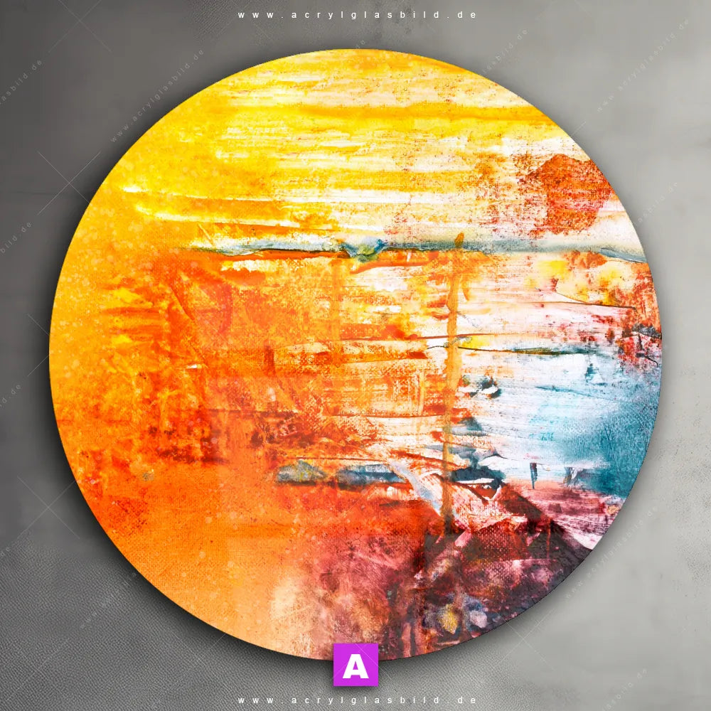 Das Motiv Klippe am Meer wird im UV-Direktdruck in den Farben Orange, Blau, Hellblau, Weiss auf die Rückseite einer 5mm starken, transparenten Acrylglasplatte gedruckt. Das durchscheinende Motiv abstrakte Klippen im Abstrakt, Modern Art Stil wird anschließend vollflächig mit einer weißen Schicht hinterlegt. Das Muster - Texturen Acrylglasbild | Rund erhält so eine bemerkenswerte Farbbrillanz, hohe Schärfe und erstaunliche Tiefenwirkung.