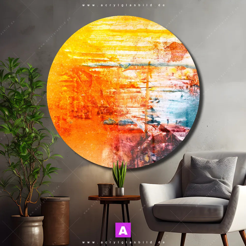 <b>Produktart:</b> Acrylglasbild | Glasbild | Wandbild aus Kunstglas | <b> Motiv:</b> Klippe am Meer | <b> Bildausrichtung:</b> Rund | <b> Max. Motiv-Größe:</b> 180cm breit | 180cm hoch | <b> Verfügbare Formate: </b> Quadrat, Querformat, Hochformat, Panorama, Schmal, Rund | <b> Kategorie:</b> Muster - Texturen | <b> Farben:</b> Orange, Blau, Hellblau, Weiss | <b> Kunstformen:</b> Digitale Kunst, Kunst - Malerei | <b> Kunststile:</b> Abstrakt, Modern Art