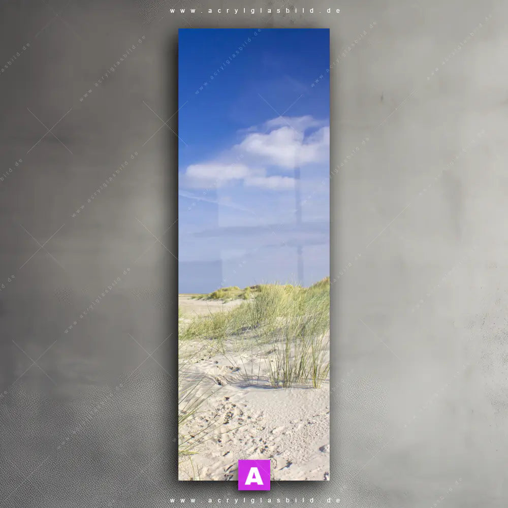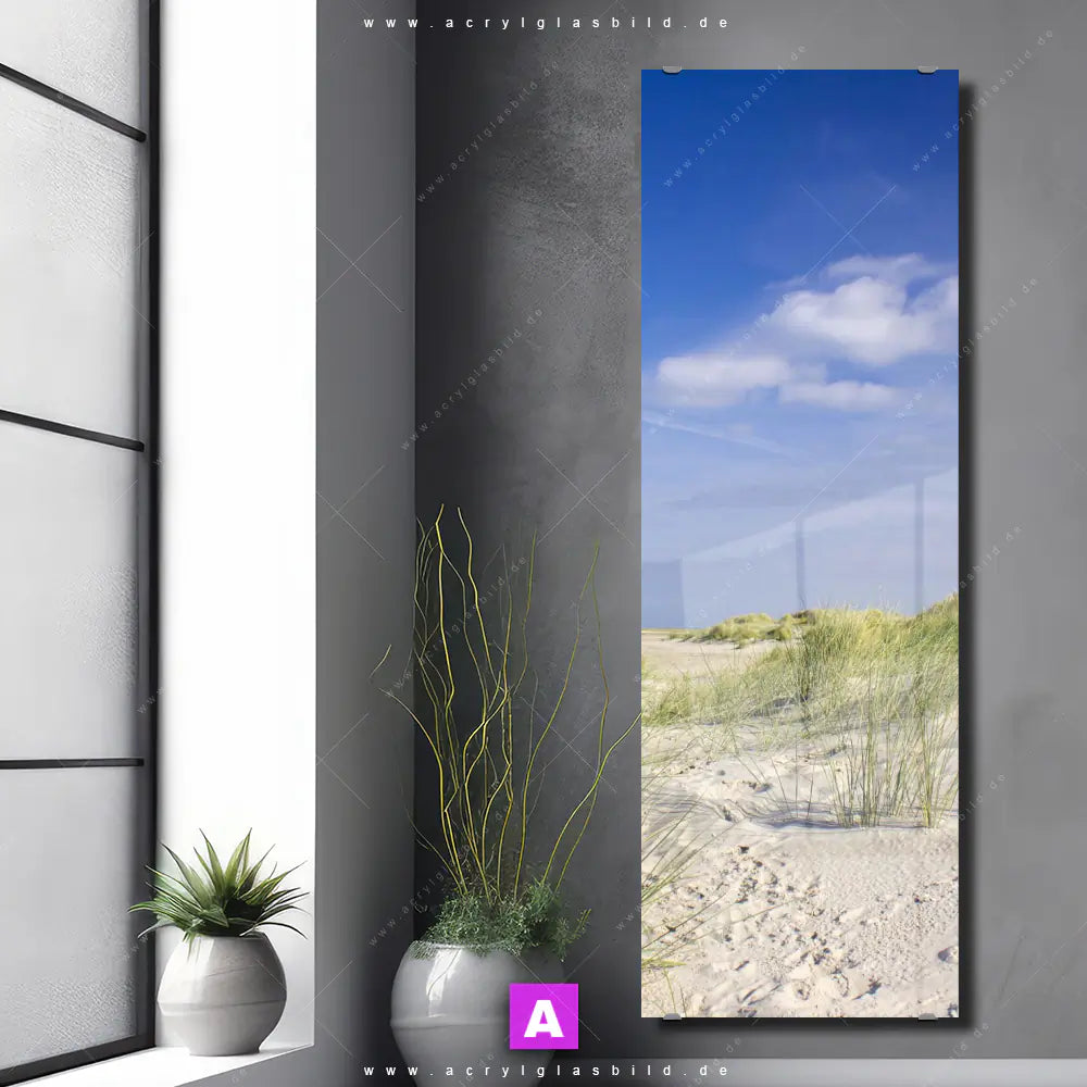 Langweilige Wände sind wie ein trockenes Toastbrot ohne Butter und Marmelade - einfach fade und nicht sehr appetitlich. Aber zum Glück haben wir das perfekte Acrylglasbild für dich: Mit unserem Kunstwerk Küstenwanderung durch Sanddünen im Format Schmal wird deine Wand zur Leinwand und dein Raum zum Blickfang.