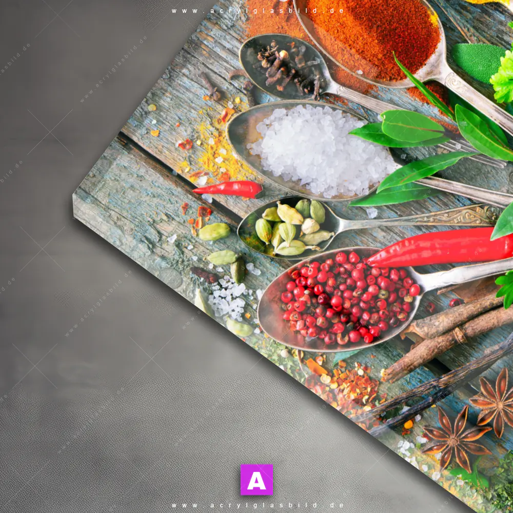 Begriffe wie Gewürze, Kräuter, Löffel, kochen, Besteck haben Dich auf der Suche nach Deinem neuen Wandbild aus Acrylglas inspiriert? Dann sollte das Acrylglasbild Verschiedene Gewürze auf Holz den Weg zu Dir finden.