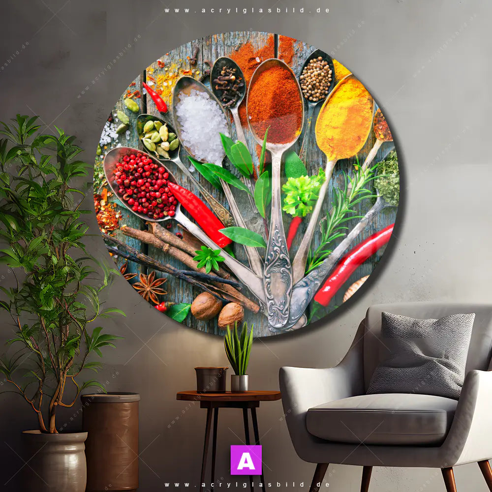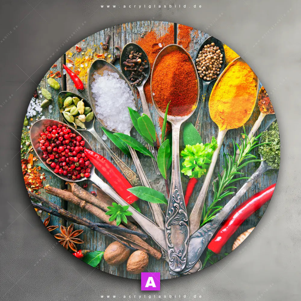 <b>Produktart:</b> Acrylglasbild | Glasbild | Wandbild aus Kunstglas | <b> Motiv:</b> Löffel mit Kräutern und Gewürzen | <b> Bildausrichtung:</b> Rund | <b> Max. Motiv-Größe:</b> 450cm breit | 300cm hoch | <b> Verfügbare Formate: </b> Quadrat, Querformat, Hochformat, Panorama, Schmal, Rund | <b> Kategorie:</b>  Essen - Trinken | <b> Farben:</b>  Bunt, Braun, Silber, Rot, Grün, Gelb | <b> Kunstformen:</b>  Fotografie | <b> Kunststile:</b>  Natürlich - Realistisch, Retro - Vintage