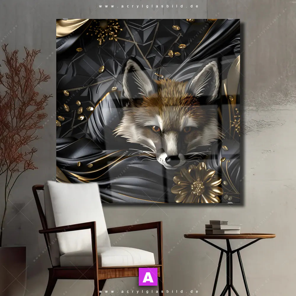 <b>Produktart:</b> Acrylglasbild | Glasbild | Wandbild aus Kunstglas | <b> Motiv:</b> Luxuriöser Fuchs mit Blumen | <b> Bildausrichtung:</b> Quadrat | <b> Max. Motiv-Größe:</b> 360cm breit | 240cm hoch | <b> Verfügbare Formate: </b> Quadrat, Querformat, Hochformat, Panorama, Schmal, Rund | <b> Kategorie:</b>  Tierwelt, Blumen - Botanik | <b> Farben:</b>  Gold, Schwarz, Beige | <b> Kunstformen:</b>  Digitale Kunst | <b> Kunststile:</b>  Floral, Modern Art