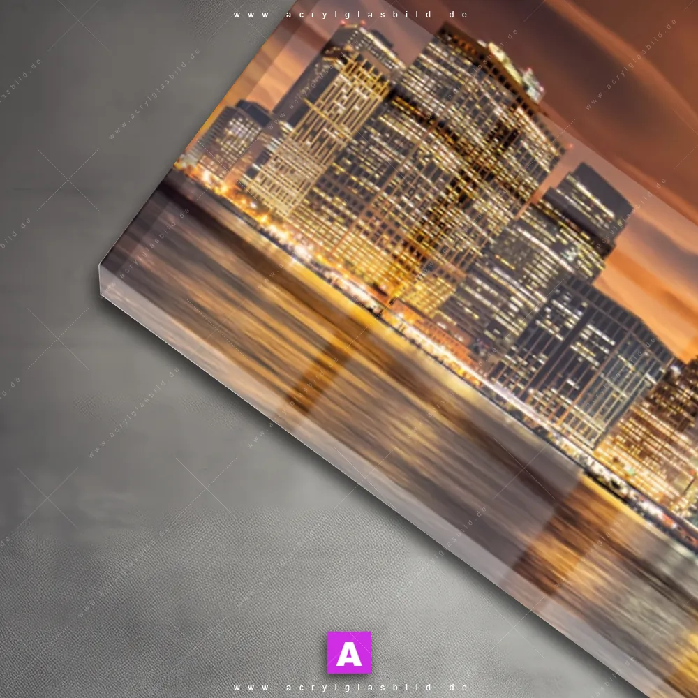 Das Motiv Manhatten bei Sonnenuntergang wird im UV-Direktdruck in den Farben Orange, Braun, Schwarz auf die Rückseite einer 5mm starken, transparenten Acrylglasplatte gedruckt. Das durchscheinende Motiv Abend in NYC im Modern Art Stil wird anschließend vollflächig mit einer weißen Schicht hinterlegt. Das Städte - Skylines Acrylglasbild | Panorama erhält so eine bemerkenswerte Farbbrillanz, hohe Schärfe und erstaunliche Tiefenwirkung.
