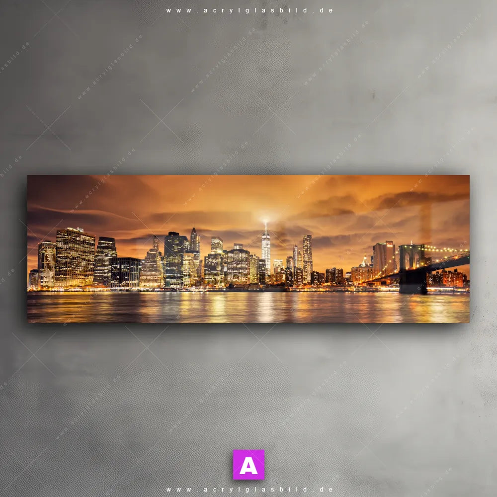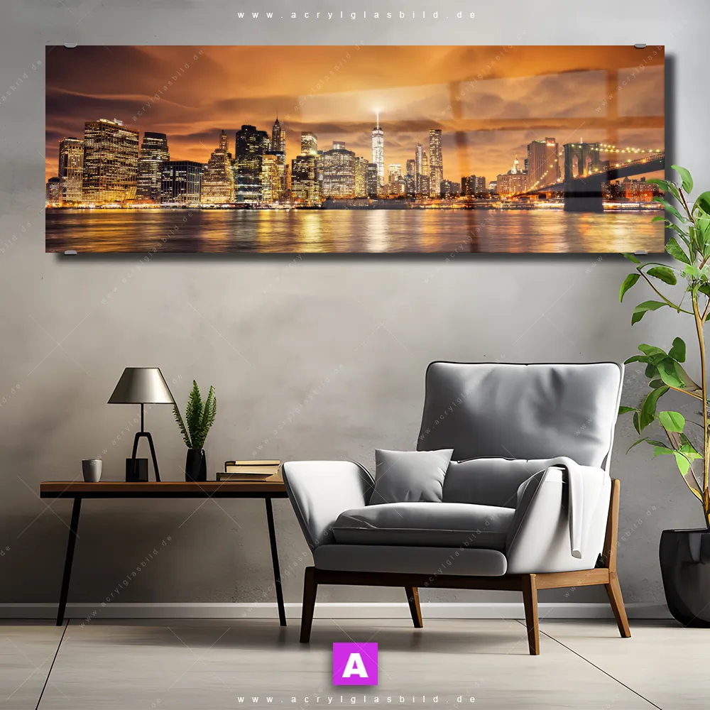 Fehlt dir die Inspiration beim Anblick deiner Wände, sodass selbst das Zählen der Wandfarbtropfen aufregender erscheint? Keine Sorge, wir haben das perfekte Kunstwerk für dich! Mit unserem Acrylglasbild Manhatten bei Sonnenuntergang im Panorama-Format verleihst du deinem Raum den dringend benötigten Wow-Faktor. Lass deine Wände mit unserem Abendstimmung New York City Acrylglasbild zum Star werden!