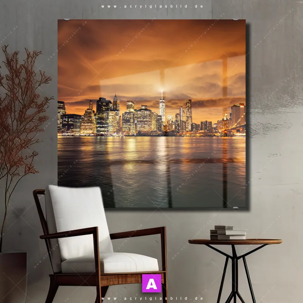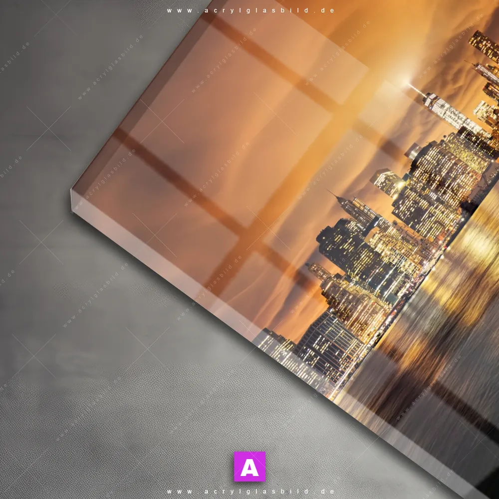 Das Motiv Manhatten bei Sonnenuntergang wird im UV-Direktdruck in den Farben Orange, Braun, Schwarz auf die Rückseite einer 5mm starken, transparenten Acrylglasplatte gedruckt. Das durchscheinende Motiv Abend in NYC im Modern Art Stil wird anschließend vollflächig mit einer weißen Schicht hinterlegt. Das Städte - Skylines Acrylglasbild | Quadrat erhält so eine bemerkenswerte Farbbrillanz, hohe Schärfe und erstaunliche Tiefenwirkung.