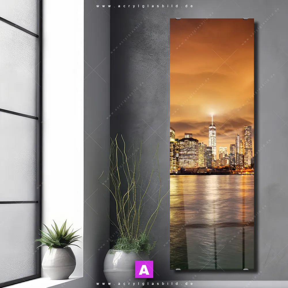 <b>Produktart:</b> Acrylglasbild | Glasbild | Wandbild aus Kunstglas | <b> Motiv:</b> Manhatten bei Sonnenuntergang | <b> Bildausrichtung:</b> Schmal | <b> Max. Motiv-Größe:</b> 270cm breit | 180cm hoch | <b> Verfügbare Formate: </b> Quadrat, Querformat, Hochformat, Panorama, Schmal, Rund | <b> Kategorie:</b> Städte - Skylines | <b> Farben:</b> Orange, Braun, Schwarz | <b> Kunstformen:</b> Fotografie | <b> Kunststile:</b> Modern Art