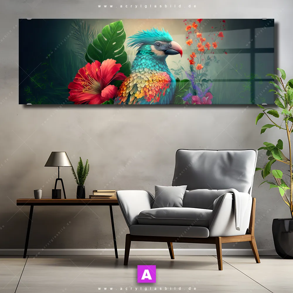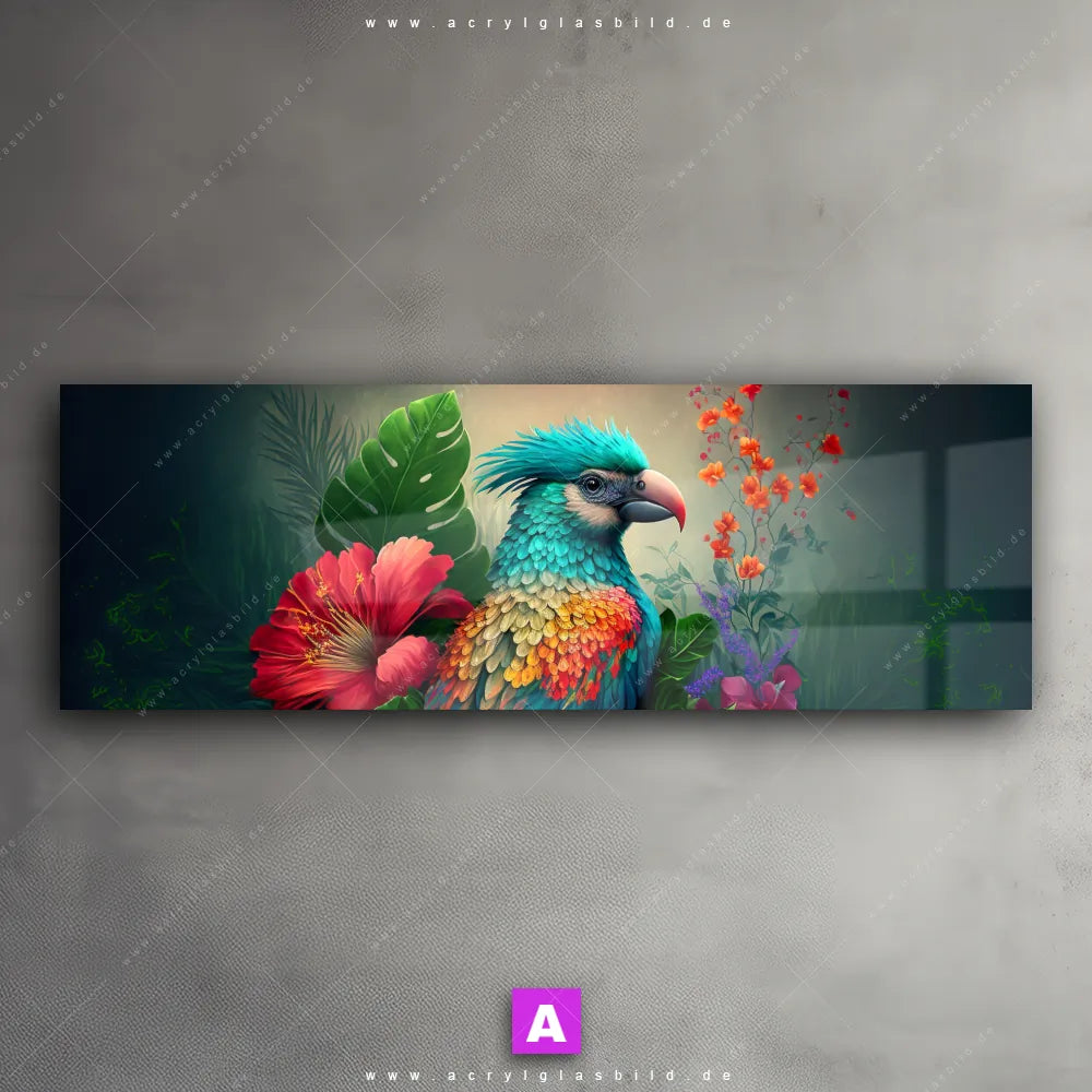 <b>Produktart:</b> Acrylglasbild | Glasbild | Wandbild aus Kunstglas | <b> Motiv:</b> Papagei und tropischer Hibiskus | <b> Bildausrichtung:</b> Panorama | <b> Max. Motiv-Größe:</b> 315cm breit | 210cm hoch | <b> Verfügbare Formate: </b> Quadrat, Querformat, Hochformat, Panorama, Schmal, Rund | <b> Kategorie:</b> Tierwelt, Blumen - Botanik | <b> Farben:</b> Blau, Grün, Rot | <b> Kunstformen:</b> Digitale Kunst | <b> Kunststile:</b> Floral, Modern Art