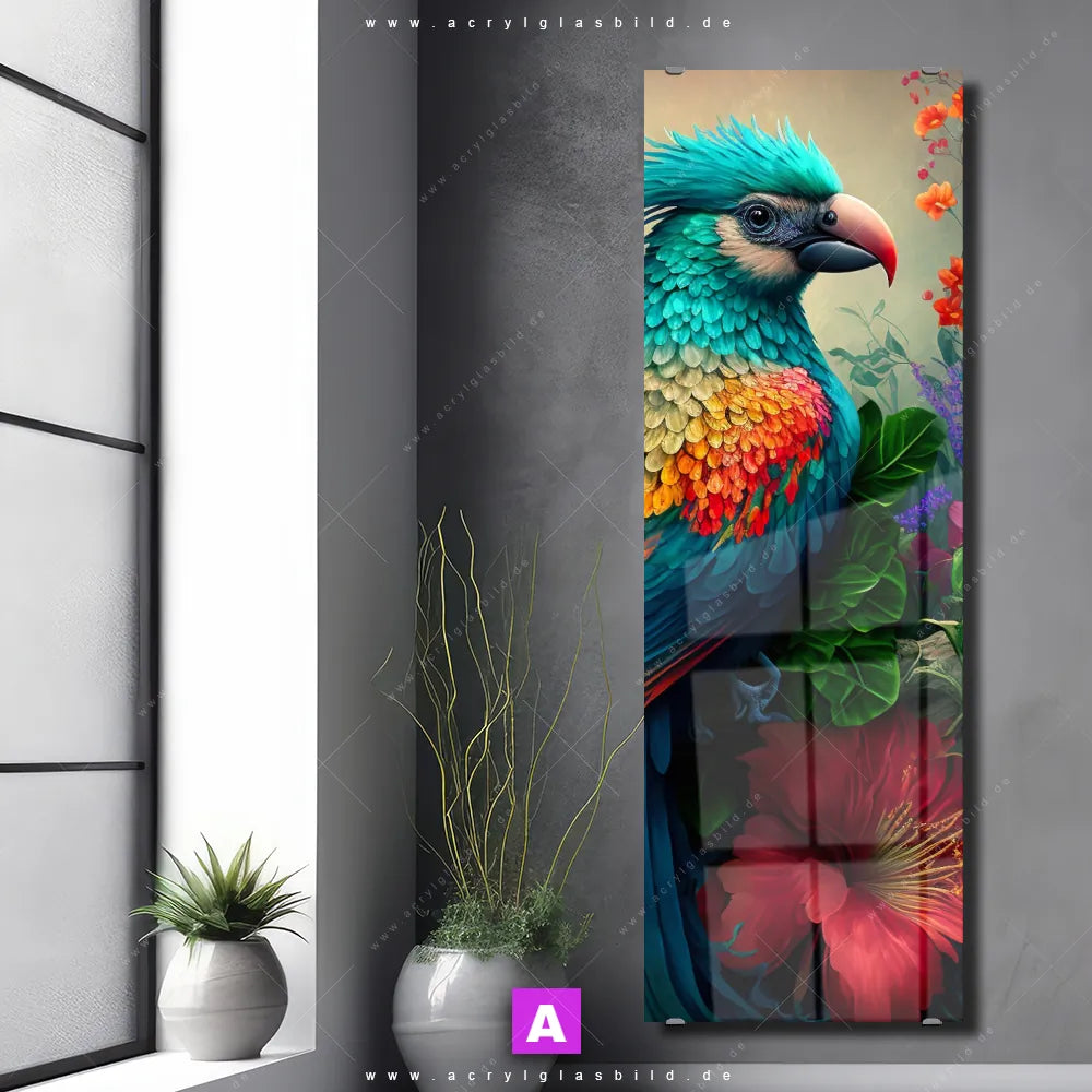 <b>Produktart:</b> Acrylglasbild | Glasbild | Wandbild aus Kunstglas | <b> Motiv:</b> Papagei und tropischer Hibiskus | <b> Bildausrichtung:</b> Schmal | <b> Max. Motiv-Größe:</b> 315cm breit | 210cm hoch | <b> Verfügbare Formate: </b> Quadrat, Querformat, Hochformat, Panorama, Schmal, Rund | <b> Kategorie:</b> Tierwelt, Blumen - Botanik | <b> Farben:</b> Blau, Grün, Rot | <b> Kunstformen:</b> Digitale Kunst | <b> Kunststile:</b> Floral, Modern Art