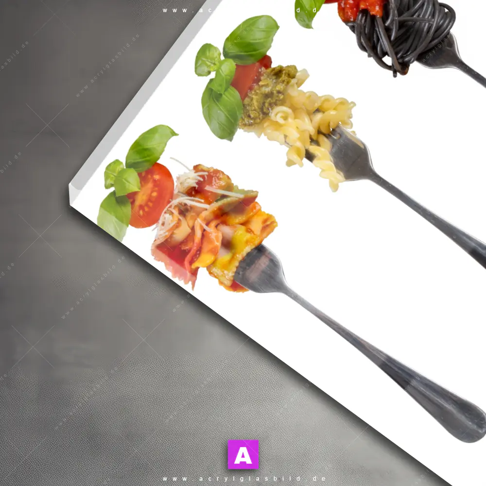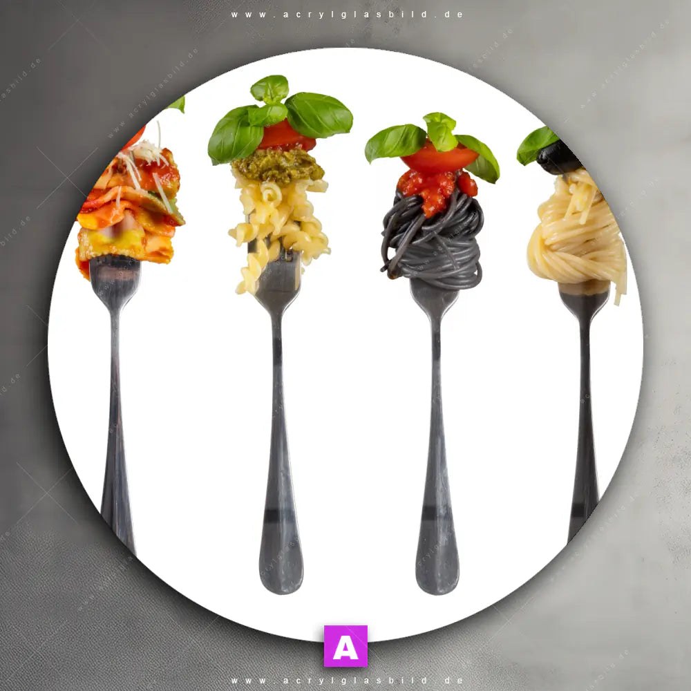 Hey du! Bist du es auch leid, auf langweilige, weiße Wände in deinem Raum zu starren und dich zu fragen, ob das der Sinn des Lebens ist? Unser Acrylglasbild mit dem Titel Pasta auf Gabeln im Format Rund verwandelt deine Wand in ein Kunstwerk und macht deinen Raum zum absoluten Hingucker.
