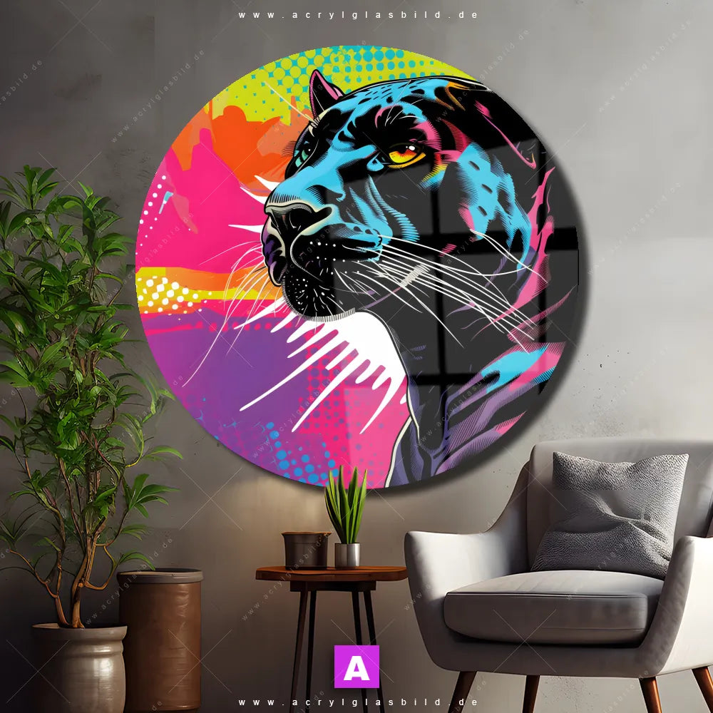<b>Produktart:</b> Acrylglasbild | Glasbild | Wandbild aus Kunstglas | <b> Motiv:</b> Pop Art Panther | <b> Bildausrichtung:</b> Rund | <b> Max. Motiv-Größe:</b> 450cm breit | 300cm hoch | <b> Verfügbare Formate: </b> Quadrat, Querformat, Hochformat, Panorama, Schmal, Rund | <b> Kategorie:</b> Tierwelt | <b> Farben:</b> Schwarz, Bunt | <b> Kunstformen:</b> Digitale Kunst, Vektor - Illustration | <b> Kunststile:</b> Pop Art, Modern Art, Abstrakt
