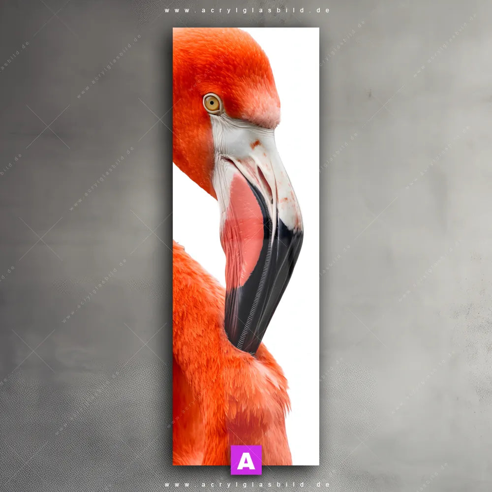 <b>Produktart:</b> Acrylglasbild | Glasbild | Wandbild aus Kunstglas | <b> Motiv:</b> Rosa Flamingo | <b> Bildausrichtung:</b> Schmal | <b> Max. Motiv-Größe:</b> 535cm breit | 300cm hoch | <b> Verfügbare Formate: </b> Quadrat, Querformat, Hochformat, Panorama, Schmal, Rund | <b> Kategorie:</b> Tierwelt | <b> Farben:</b> Orange, Rot, Weiss | <b> Kunstformen:</b> Digitale Kunst, KI-generiertes Bild | <b> Kunststile:</b> Modern Art, Natürlich - Realistisch