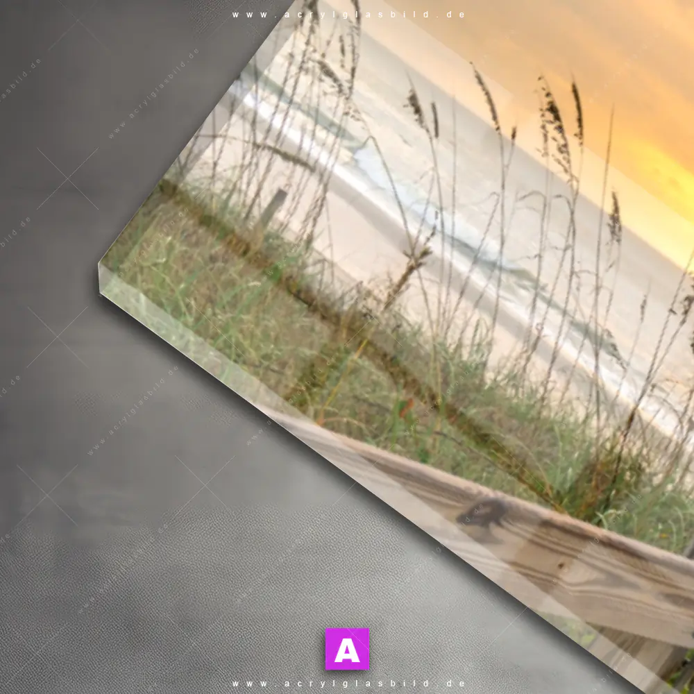 Das Motiv Sonnenuntergang am Strandweg wird im UV-Direktdruck in den Farben Beige, Grün, Braun, Orange auf die Rückseite einer 5mm starken, transparenten Acrylglasplatte gedruckt. Das durchscheinende Motiv Idyllischer Strand bei Sonnenuntergang im Natürlich - Realistisch Stil wird anschließend vollflächig mit einer weißen Schicht hinterlegt. Das Strand - Meer, Landschaften Acrylglasbild | Panorama erhält so eine bemerkenswerte Farbbrillanz, hohe Schärfe und erstaunliche Tiefenwirkung.