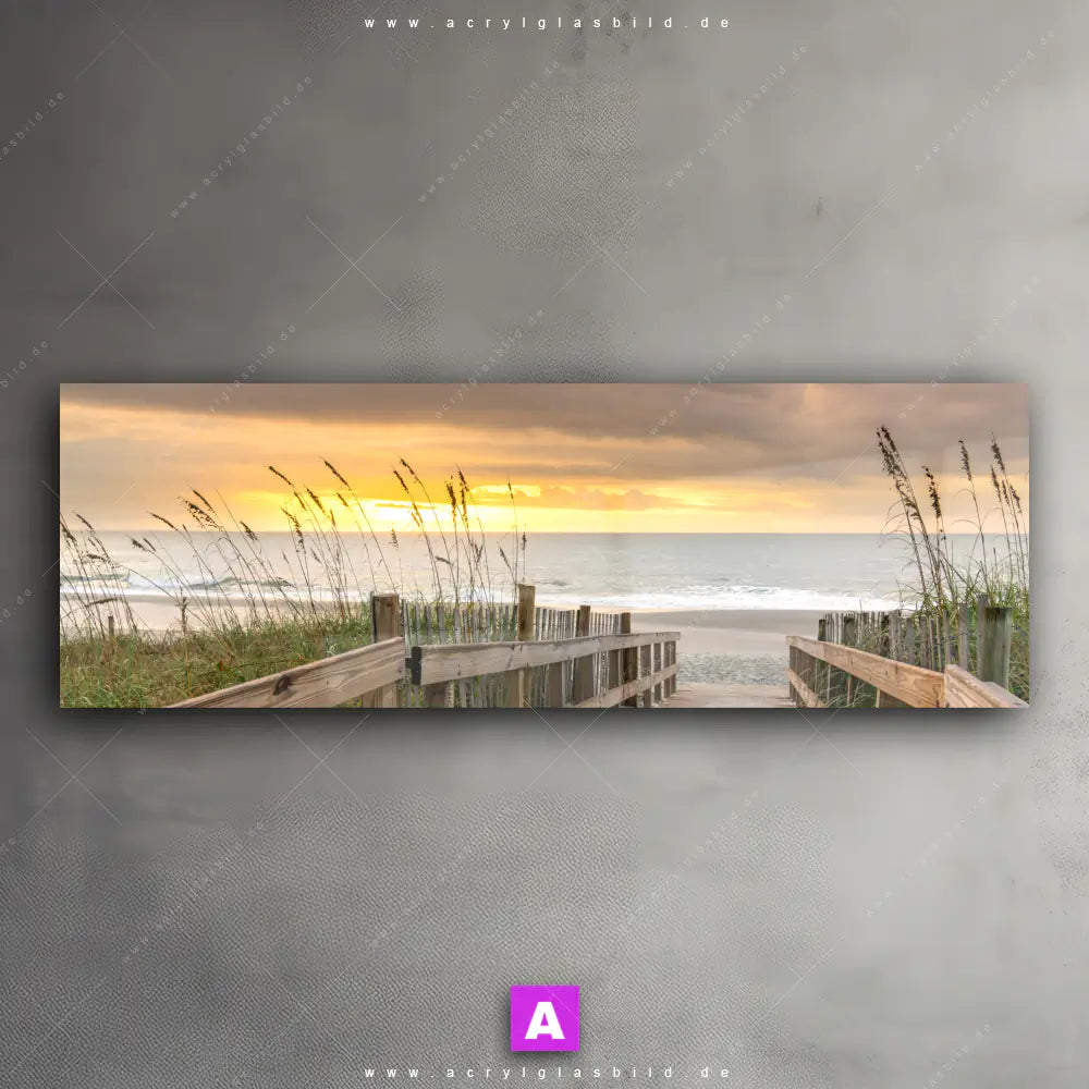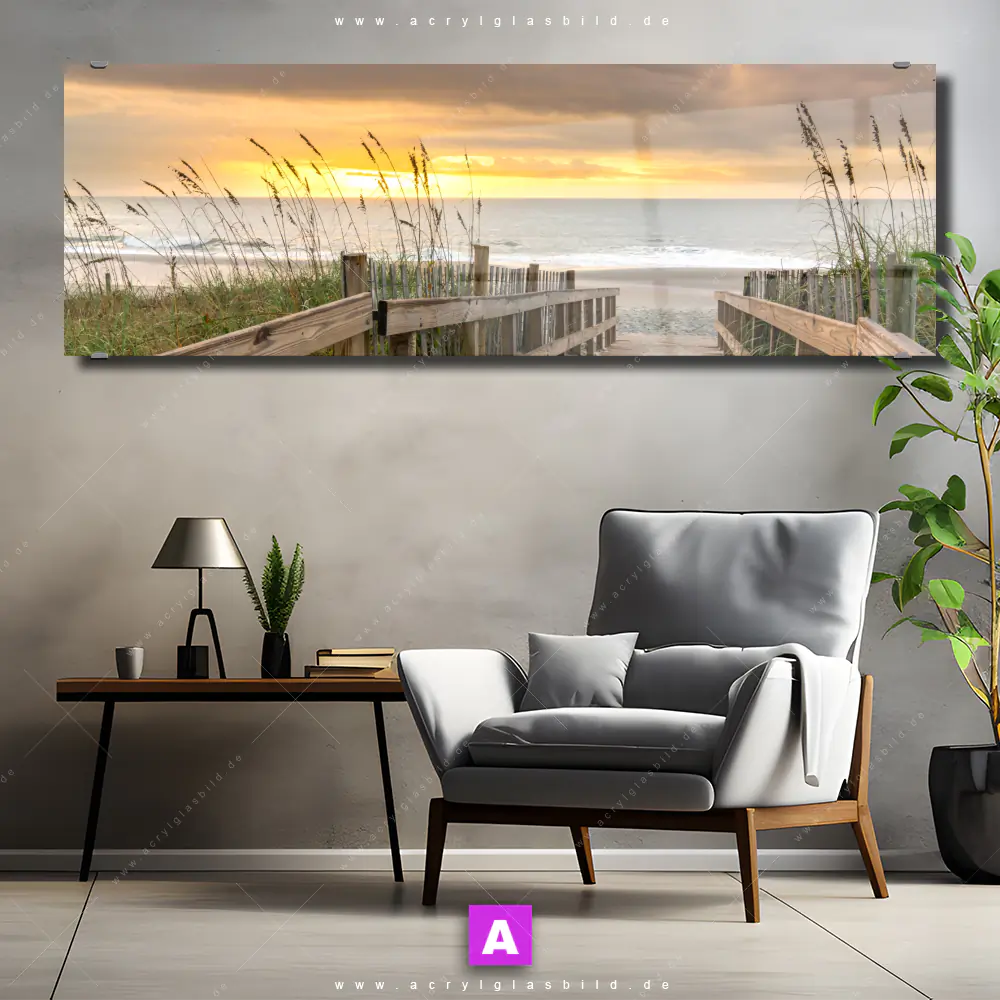 Fehlt dir die Inspiration beim Anblick deiner Wände, sodass selbst das Zählen der Wandfarbtropfen aufregender erscheint? Keine Sorge, wir haben das perfekte Kunstwerk für dich! Mit unserem Acrylglasbild Sonnenuntergang am Strandweg im Panorama-Format verleihst du deinem Raum den dringend benötigten Wow-Faktor. Lass deine Wände mit unserem Holzsteg zum Meer Acrylglasbild zum Star werden!