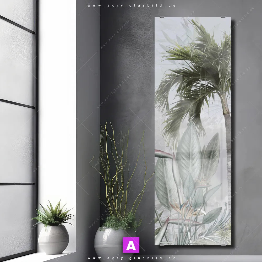 <b>Produktart:</b> Acrylglasbild | Glasbild | Wandbild aus Kunstglas | <b> Motiv:</b> Tropische Bäume und Blätter | <b> Bildausrichtung:</b> Schmal | <b> Max. Motiv-Größe:</b> 370cm breit | 240cm hoch | <b> Verfügbare Formate: </b> Quadrat, Querformat, Hochformat, Panorama, Schmal, Rund | <b> Kategorie:</b> Landschaften, Wald - Bäume | <b> Farben:</b> Grün, Mint, Grau | <b> Kunstformen:</b> Digitale Kunst | <b> Kunststile:</b> Retro - Vintage