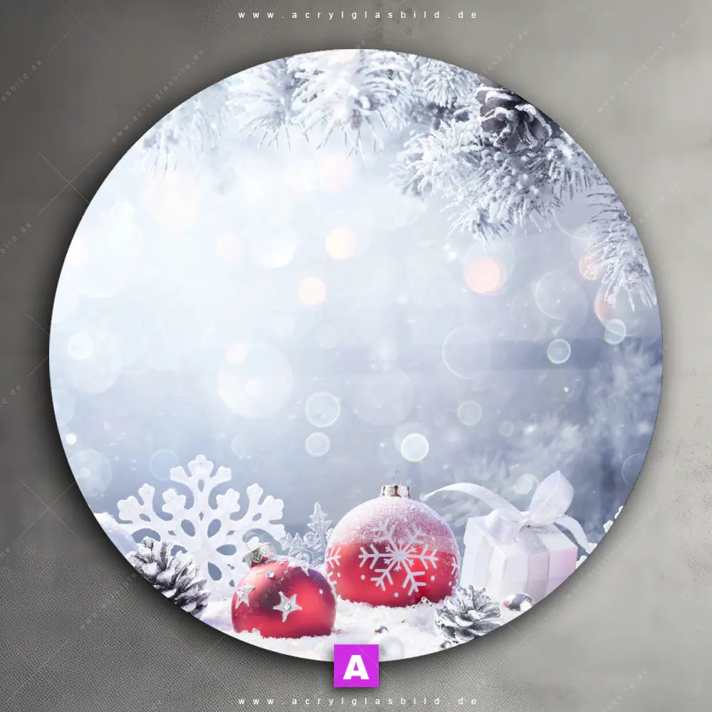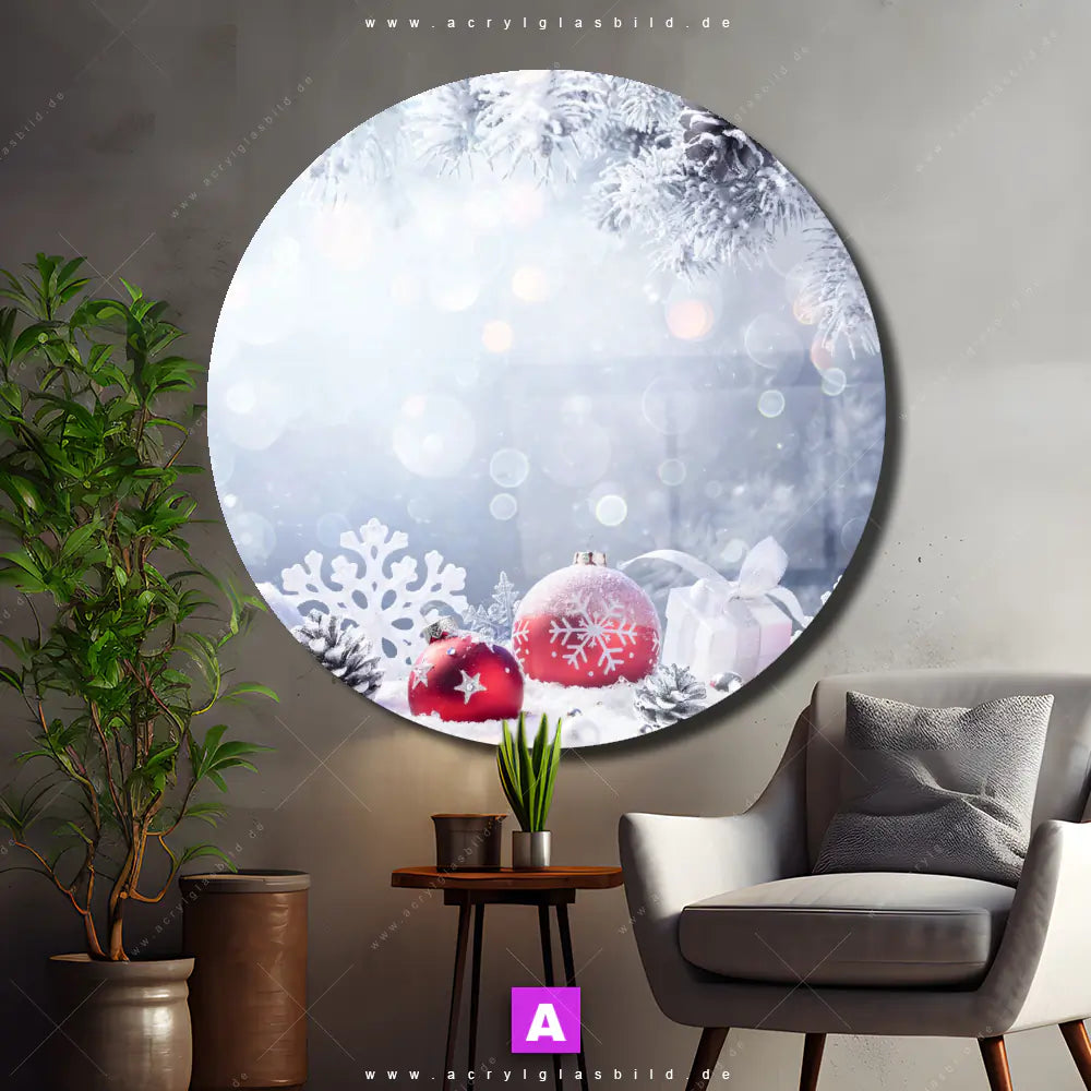 <b>Produktart:</b> Acrylglasbild | Glasbild | Wandbild aus Kunstglas | <b> Motiv:</b> Weihnachtskugeln im Winterwunderland | <b> Bildausrichtung:</b> Rund | <b> Max. Motiv-Größe:</b> 450cm breit | 300cm hoch | <b> Verfügbare Formate: </b> Quadrat, Querformat, Hochformat, Panorama, Schmal, Rund | <b> Kategorie:</b> Winter | <b> Farben:</b> Weiss, Rot, Grau | <b> Kunstformen:</b> Digitale Kunst, Vektor - Illustration | <b> Kunststile:</b> Minimalistisch, Modern Art
