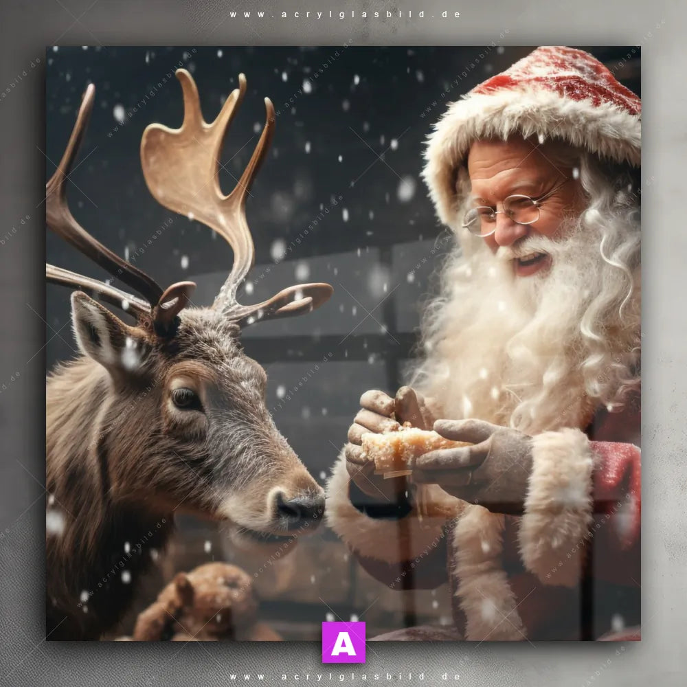 <b>Produktart:</b> Acrylglasbild | Glasbild | Wandbild aus Kunstglas | <b> Motiv:</b> Weihnachtsmann füttert Rentier | <b> Bildausrichtung:</b> Quadrat | <b> Max. Motiv-Größe:</b> 180cm breit | 100cm hoch | <b> Verfügbare Formate: </b> Quadrat, Querformat, Hochformat, Panorama, Schmal, Rund | <b> Kategorie:</b> Winter, Tierwelt | <b> Farben:</b> Rot, Braun, Weiss | <b> Kunstformen:</b> Digitale Kunst | <b> Kunststile:</b> Surreal - Fantasy