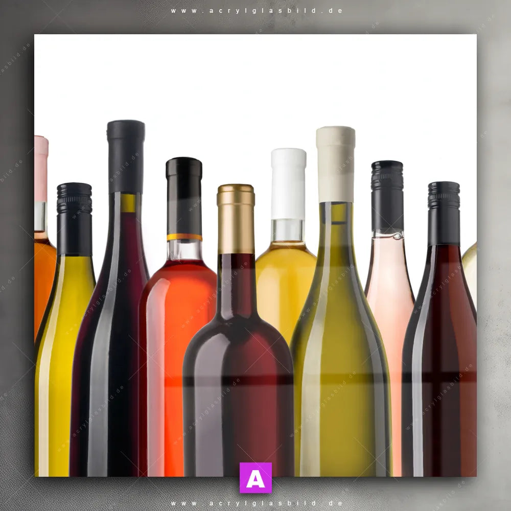 <b>Produktart:</b> Acrylglasbild | Glasbild | Wandbild aus Kunstglas | <b> Motiv:</b> Weinflaschen | <b> Bildausrichtung:</b> Quadrat | <b> Max. Motiv-Größe:</b> 400cm breit | 240cm hoch | <b> Verfügbare Formate: </b> Quadrat, Querformat, Hochformat, Panorama, Schmal, Rund | <b> Kategorie:</b> Essen - Trinken | <b> Farben:</b> Braun, Grün, Weiss, Orange, Rot | <b> Kunstformen:</b> Fotografie | <b> Kunststile:</b> Minimalistisch, Modern Art