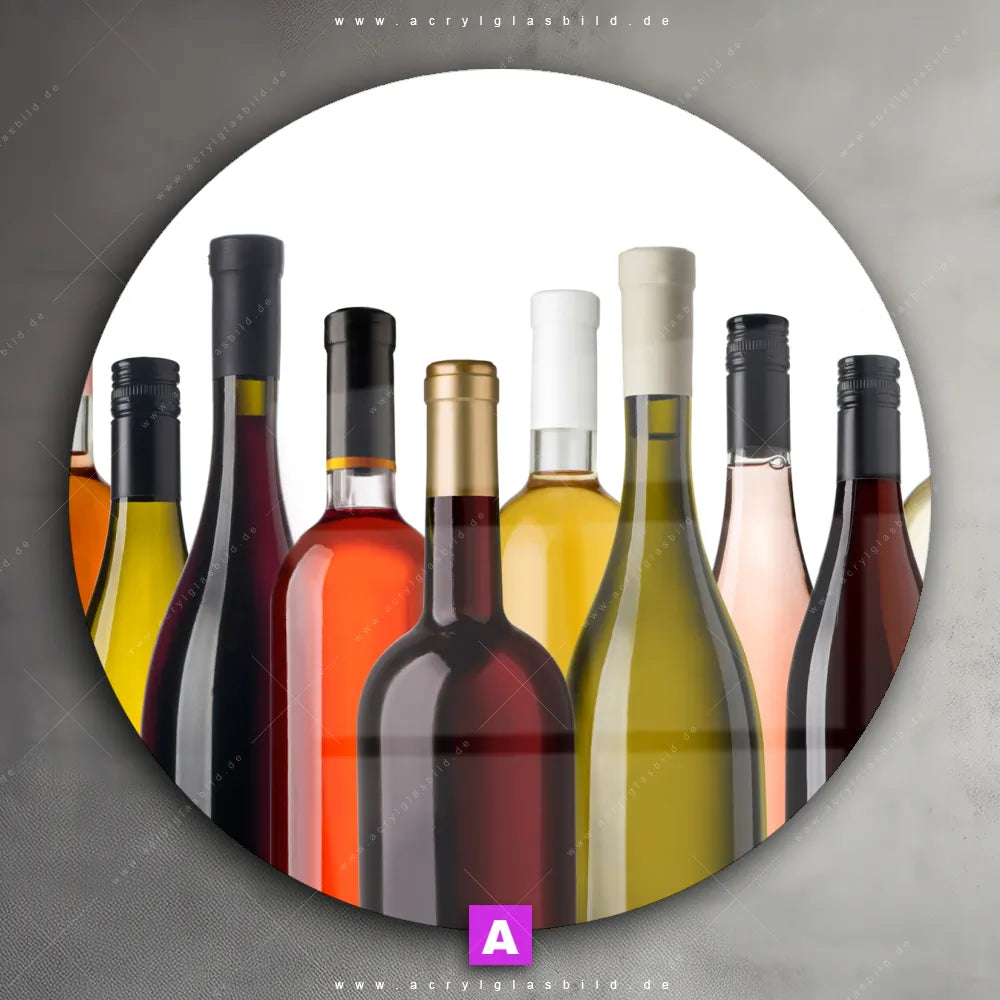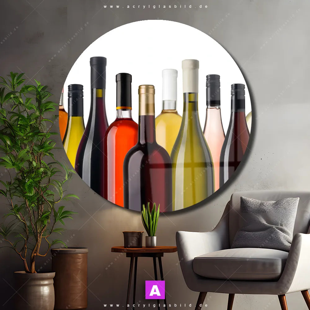 Hey du! Bist du es auch leid, auf langweilige, weiße Wände in deinem Raum zu starren und dich zu fragen, ob das der Sinn des Lebens ist? Unser Acrylglasbild mit dem Titel Weinflaschen im Format Rund verwandelt deine Wand in ein Kunstwerk und macht deinen Raum zum absoluten Hingucker.