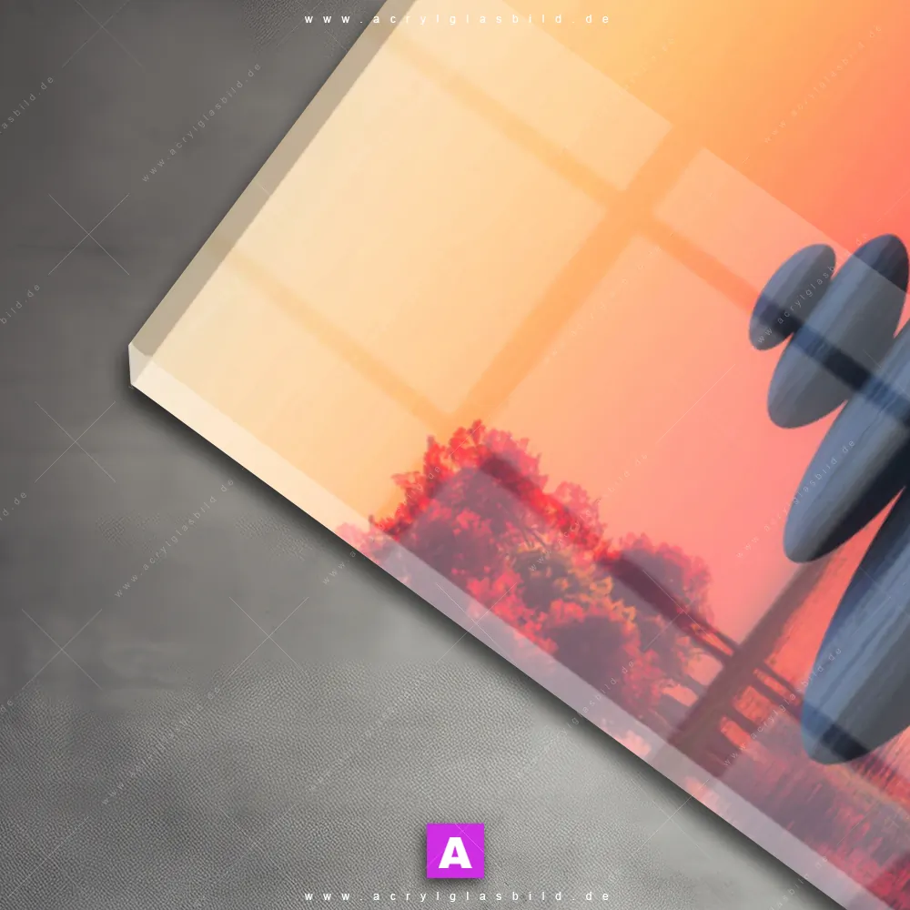 Das Motiv Zen Steine & Sonnenuntergang wird im UV-Direktdruck in den Farben Orange, Rot, Grau auf die Rückseite einer 5mm starken, transparenten Acrylglasplatte gedruckt. Das durchscheinende Motiv gestapelte Steine auf einem See im Sonnenuntergang im Minimalistisch, Modern Art Stil wird anschließend vollflächig mit einer weißen Schicht hinterlegt. Das Landschaften, Buddha - Feng Shui Acrylglasbild | Hochformat erhält so eine bemerkenswerte Farbbrillanz, hohe Schärfe und erstaunliche Tiefenwirkung.