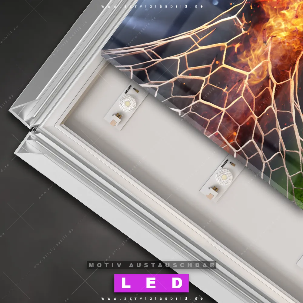 Vergiss dunkle Ecken und Langeweile! Mit unserem Acrylglasbild brennender Fußball im Netz und seiner brillanten LED-Ausleuchtung wirst du dich nie wieder in der Dunkelheit verirren. Wenn du auf der Suche nach einem beleuchteten Wandbild aus Acrylglas mit Sport, Fussball, Tor, Spielfeld, Ball, Torschuss, Netz, Meiserschaft, Feuer, Flammen, brennend bist, ist unser LED Acrylglasbild Canvalight® DIA Fußball in Flammen mit den strahlenden Motiv-Farben Grün, Blau, Orange, Weiss, Schwarz genau das richtige Leuchtbild für dich. Das im Modern Art, Natürlich - Realistisch Stil gestaltete LED Bild mit glänzender Front aus Acrylglas passt perfekt zu jedem Einrichtungsstil in Bar - Gastronomie, Flur - Eingangsbereich, Kinderzimmer – vom minimalistischen Chic bis zum kreativen Chaos.