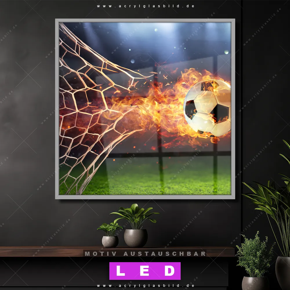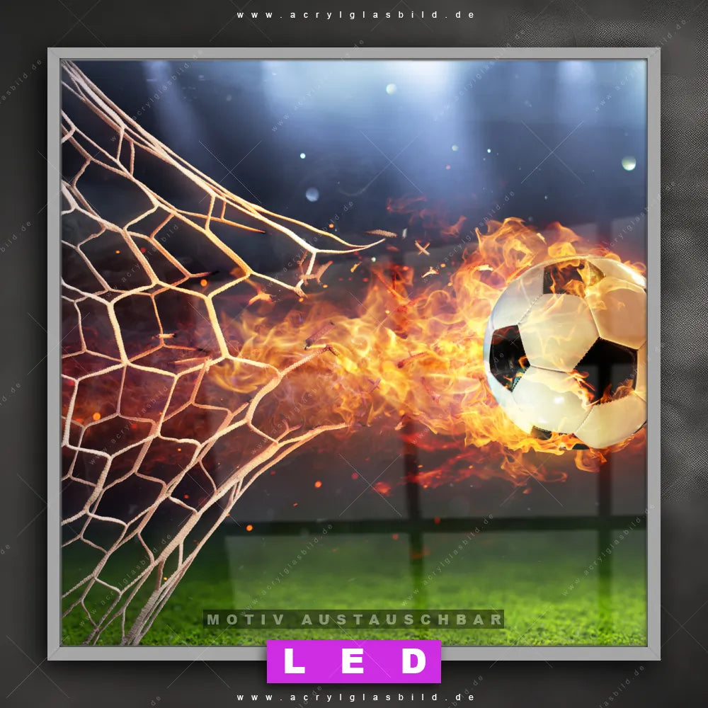 Bist du bereit, deine Wände mit einem dimmbaren LED Bild mit Fernbedienung und optionaler Farbtemperatursteuerung zum Leuchten zu bringen? Wir haben das ultimative Sport - Freizeit LED Acrylglasbild Canvalight® DIA für dich! Unser LED Wandbild aus Acrylglas Feuriger Fussball im Quadratischen Format mit austauschbarer bedruckter Acrylglas-Scheibe im DIA-Klapprahmen bringt sofort jede Menge Glanz in deine vier Wände.