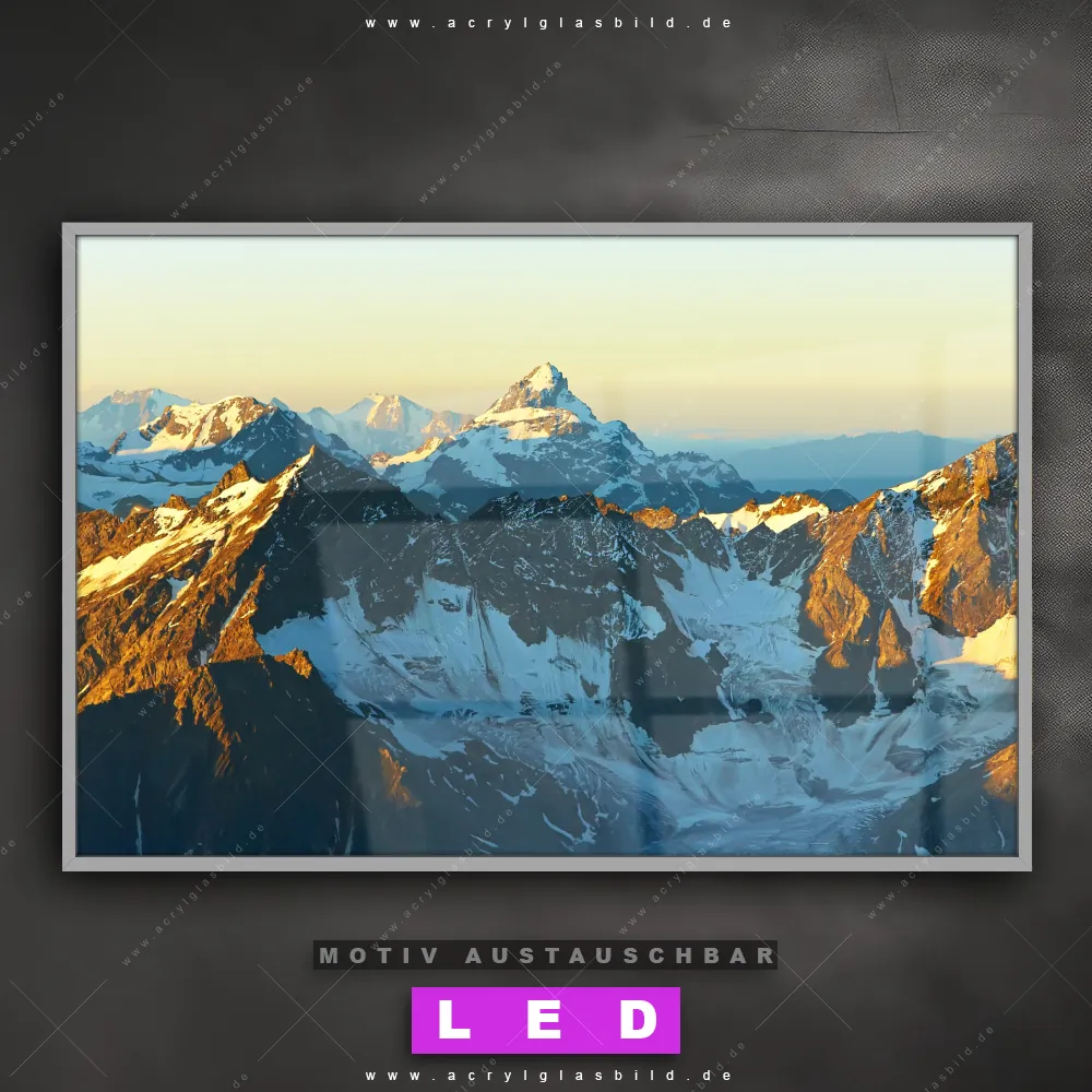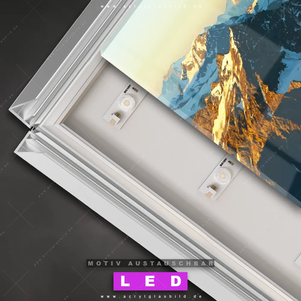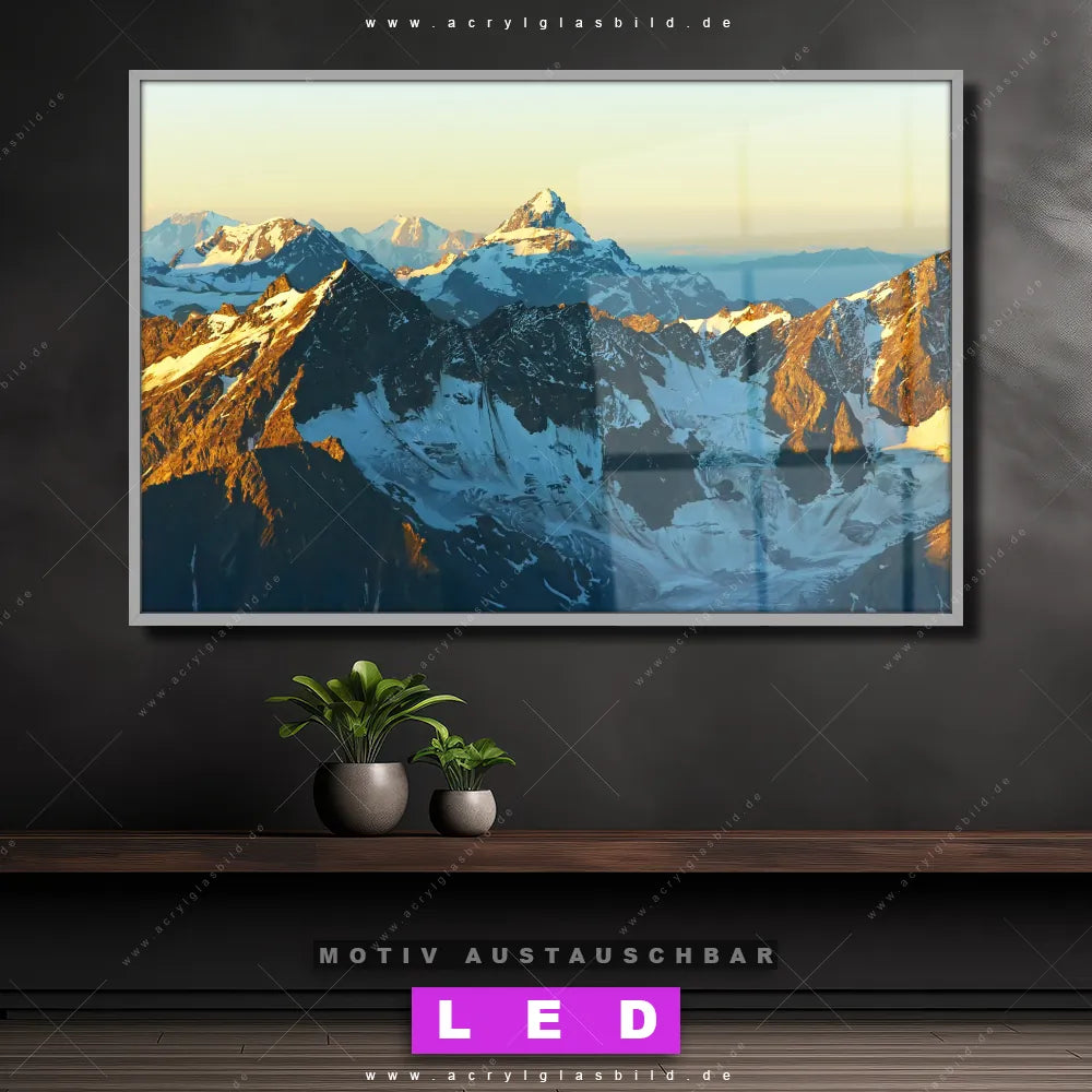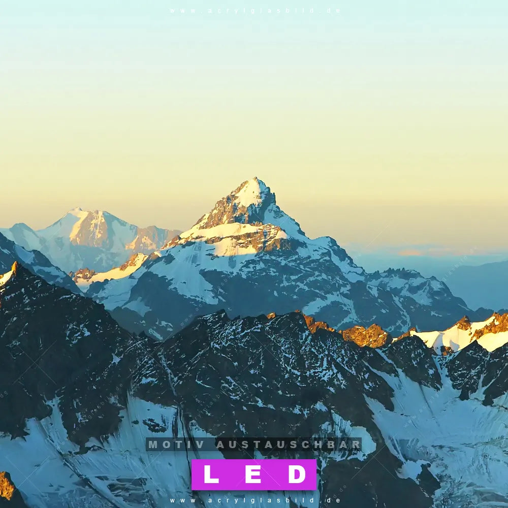 Du bist auf der Suche nach einem dimmbaren Landschaften LED Bild mit Fernbedienung und optionaler Farbtemperatursteuerung? Dann haben wir hier genau das richtige Wandbild mit LED Beleuchtung für dich: Unser Canvalight® DIA LED Acrylglasbild Gipfel in den Alpen im Querformat mit austauschbarer bedruckter Acrylglas-Scheibe. Dieses Leuchtbild bringt sofort Partybeleuchtung in deine Räume!