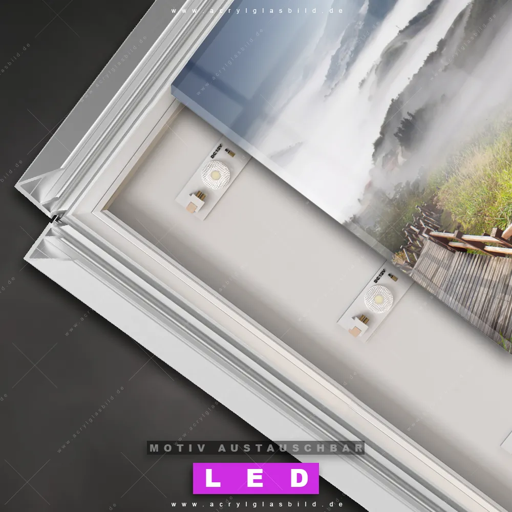 Also, worauf wartest du noch? Gib mit einem beleuchteten Wandbild mit wechselbarer Acrylglas-Scheibe deinen Wänden das gewisse Etwas und bestelle jetzt das LED Acrylglasbild Canvalight® DIA Nebelschleier Wanderweg – dein Zuhause wird es dir danken und deine Freunde werden dank der wechselbaren Motive erblassen!