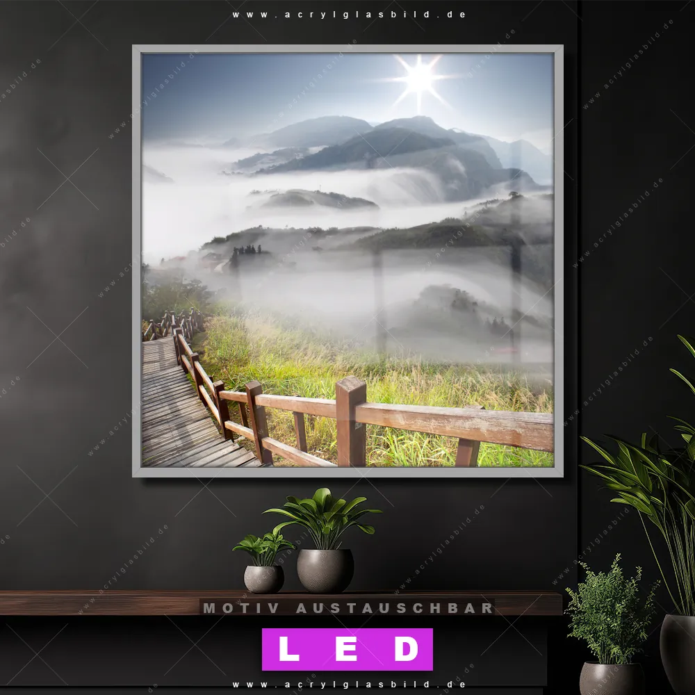 Vergiss dunkle Ecken und Langeweile! Mit unserem Acrylglasbild Morgendämmerung über Nebelbergen und seiner brillanten LED-Ausleuchtung wirst du dich nie wieder in der Dunkelheit verirren. Wenn du auf der Suche nach einem beleuchteten Wandbild aus Acrylglas mit Wanderlust, Berg, Holztreppe, Nebel, Wolken, Sonne, Sonnenaufgang, Wandern, Natur, Landschaft bist, ist unser LED Acrylglasbild Canvalight® DIA Nebelumhüllter Berg mit Treppe mit den strahlenden Motiv-Farben Blau, Braun, Weiss, Grün genau das richtige Leuchtbild für dich. Das im Natürlich - Realistisch Stil gestaltete LED Bild mit glänzender Front aus Acrylglas passt perfekt zu jedem Einrichtungsstil in Büro - Kanzlei, Wohnzimmer - Schlafzimmer, Flur - Eingangsbereich, Arzt - Praxis – vom minimalistischen Chic bis zum kreativen Chaos.