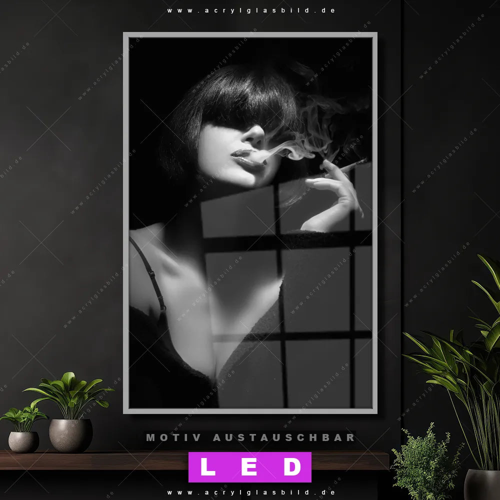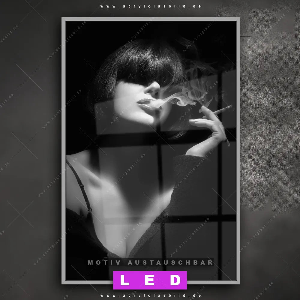 Du suchst nach einem Wandbild mit LED Beleuchtung als ultimativen Hingucker für deine Wände? Dann haben wir das perfekte dimmbare LED Bild mit Fernbedienung und optionaler Farbtemperatursteuerung für dich: unser abgefahrenes Porträts - Menschen Canvalight® DIA LED Acrylglasbild! Mit dem LED Leuchtbild aus Acrylglas Rauchende Lady im Hochformat mit austauschbarer bedruckter Acrylglas-Scheibe bringst du nicht nur Licht, sondern auch ordentlich Stil in deine Bude.