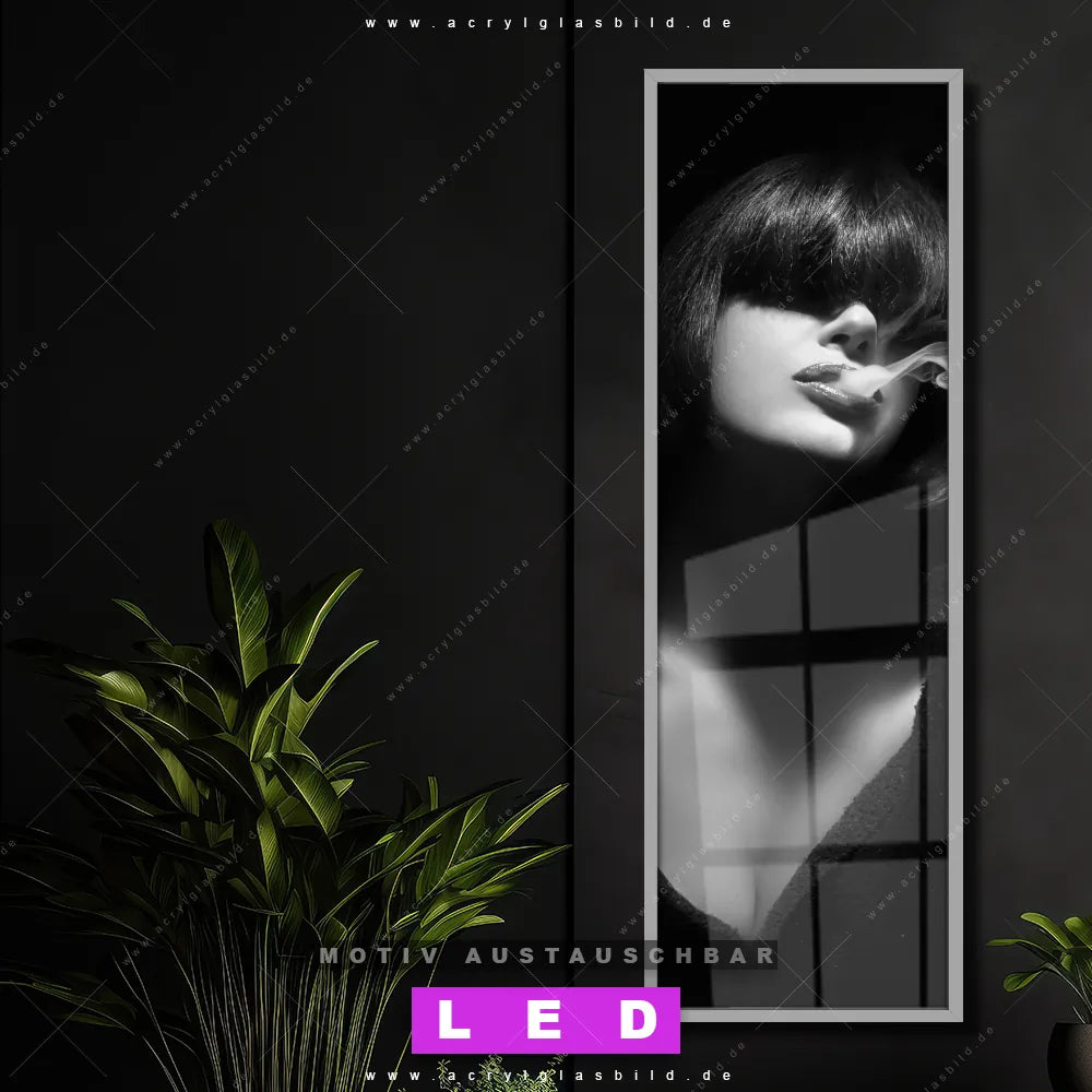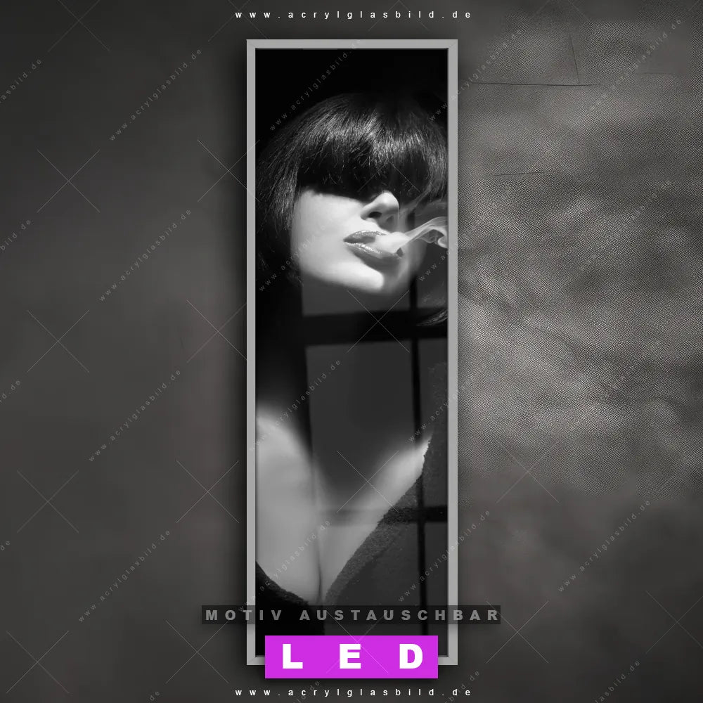 Bist du bereit, deine Wände mit einem dimmbaren LED Bild mit Fernbedienung und optionaler Farbtemperatursteuerung auf das nächste Level zu bringen? Unser Porträts - Menschen Canvalight® DIA LED Acrylglasbild ist genau das, was du brauchst! Das Wandbild mit LED Beleuchtung im Schmalen Format mit austauschbarer bedruckter Acrylglas-Scheibe Rauchende Lady bringt Licht und Stil in dein Zuhause – und das in null Komma nichts!