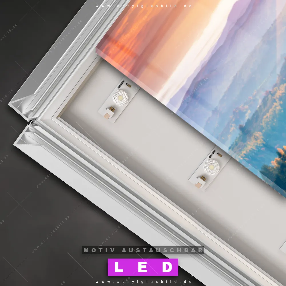 Deine Wände könnten dringend ein dimmbares LED Bild mit Fernbedienung und optionaler Farbtemperatursteuerung gebrauchen? Dann haben wir das perfekte Wandbild mit LED Beleuchtung für dich: unser mega-cooles Landschaften Canvalight® DIA LED Acrylglasbild! Mit unserem angesagten Leuchtbild aus Acrylglas im Panorama-Format und der austauschbaren bedruckten Acrylglas-Scheibe Schönheitswelt bringst du nicht nur Licht, sondern auch jede Menge Flair in deine Räume.