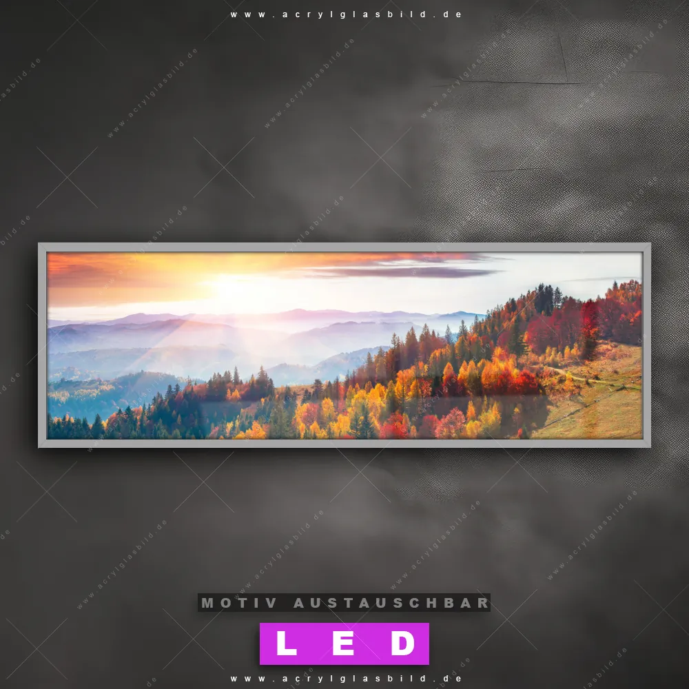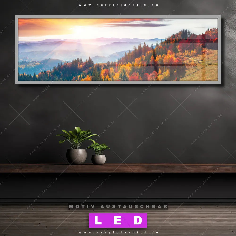 Wer will schon dunkle, triste Wände? Mit unserem LED Acrylglasbild Canvalight® DIA Sonnenuntergang im Herbst und seiner fantastischen LED-Ausleuchtung werden deine Wände in Wohnzimmer - Schlafzimmer, Flur - Eingangsbereich, Büro - Kanzlei, Arzt - Praxis zu echten Hinguckern. Wenn du auf der Suche nach einem beleuchteten Wandbild aus Acrylglas mit Wald, Landschaft, Bäume, Natur, Baum, Buche, Ruhe, Stille bist, dann solltest du unser LED Leuchhtbild farbenfrohe Landschaft mit den beeindruckenden Motiv-Farben Braun, Orange, Lila, Grün nicht verpassen. Gestaltet im angesagten Natürlich - Realistisch Stil, passt das LED Bild mit DIA-Klapprahmen und wechselbarer Acrylglas-Scheibe perfekt zu jedem Einrichtungsstil – selbst in deinem kleinen Dschungel aus Kreativität und Chaos!