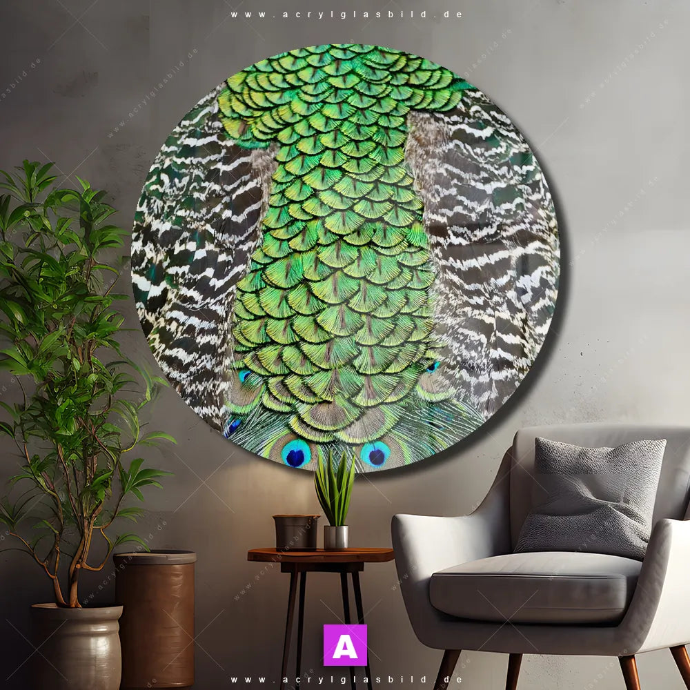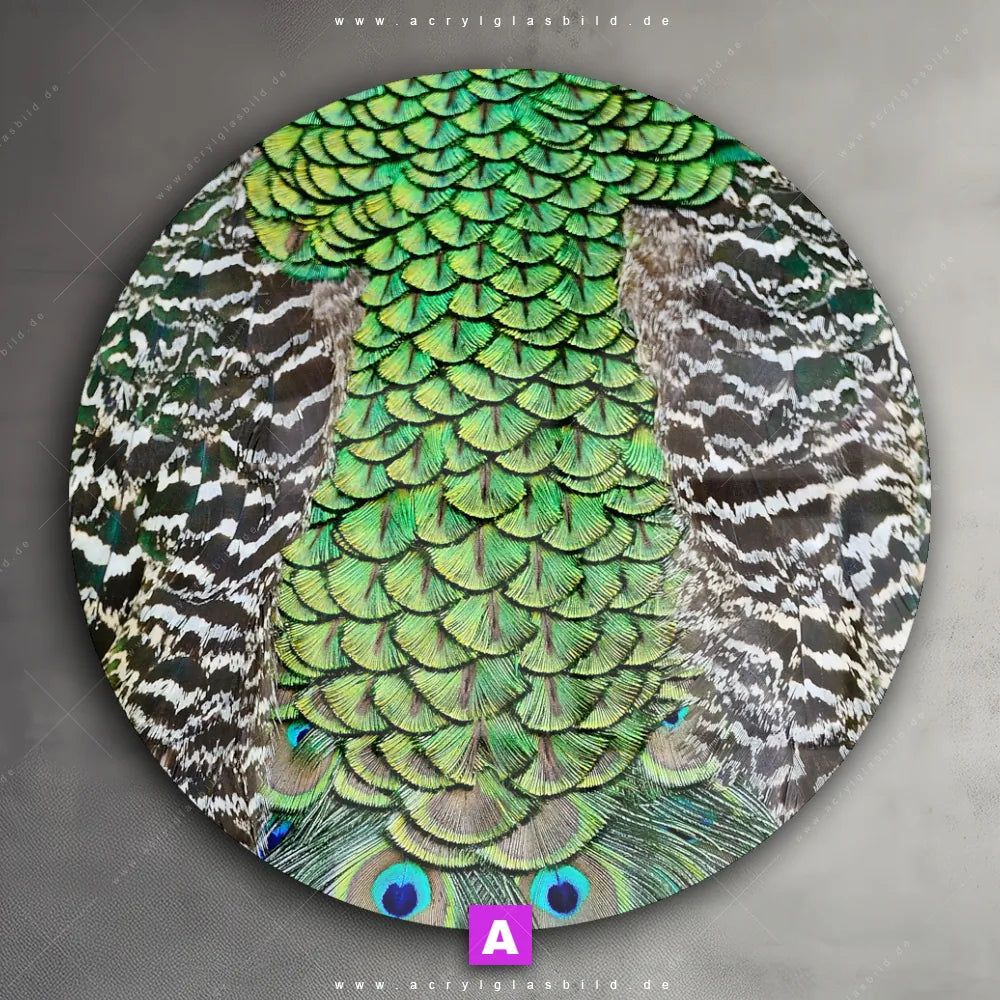 <b>Produktart:</b> Acrylglasbild | Glasbild | Wandbild aus Kunstglas | <b> Motiv:</b> Pfaufedern | <b> Bildausrichtung:</b> Rund | <b> Max. Motiv-Größe:</b> 100cm breit | 210cm hoch | <b> Verfügbare Formate: </b> Quadrat, Querformat, Hochformat, Panorama, Schmal, Rund | <b> Kategorie:</b> Tierwelt, Muster - Texturen | <b> Farben:</b> Grün, Blau | <b> Kunstformen:</b> Fotografie | <b> Kunststile:</b> Natürlich - Realistisch