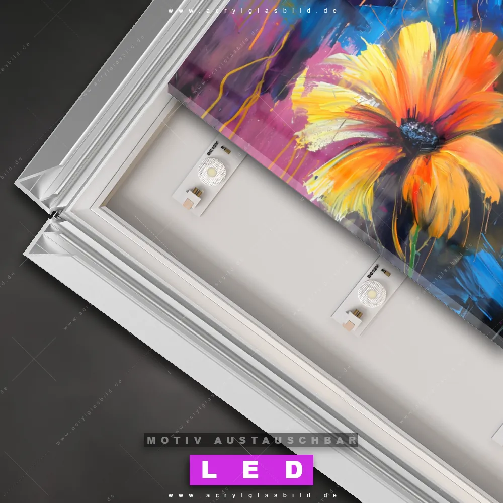 Du suchst nach einem Wandbild mit LED Beleuchtung als ultimativen Hingucker für deine Wände? Dann haben wir das perfekte dimmbare LED Bild mit Fernbedienung und optionaler Farbtemperatursteuerung für dich: unser abgefahrenes Blumen - Botanik Canvalight® DIA LED Acrylglasbild! Mit dem LED Leuchtbild aus Acrylglas Abstrakte Blumenpracht im Hochformat mit austauschbarer bedruckter Acrylglas-Scheibe bringst du nicht nur Licht, sondern auch ordentlich Stil in deine Bude.