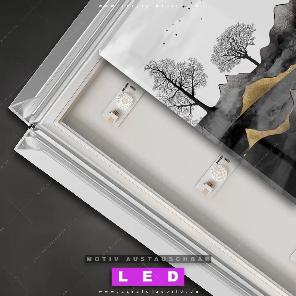 Also, worauf wartest du noch? Gib mit einem beleuchteten Wandbild mit wechselbarer Acrylglas-Scheibe deinen Wänden das gewisse Etwas und bestelle jetzt das LED Acrylglasbild Canvalight® DIA Berglandschaft in schwarz-gold – dein Zuhause wird es dir danken und deine Freunde werden dank der wechselbaren Motive erblassen!