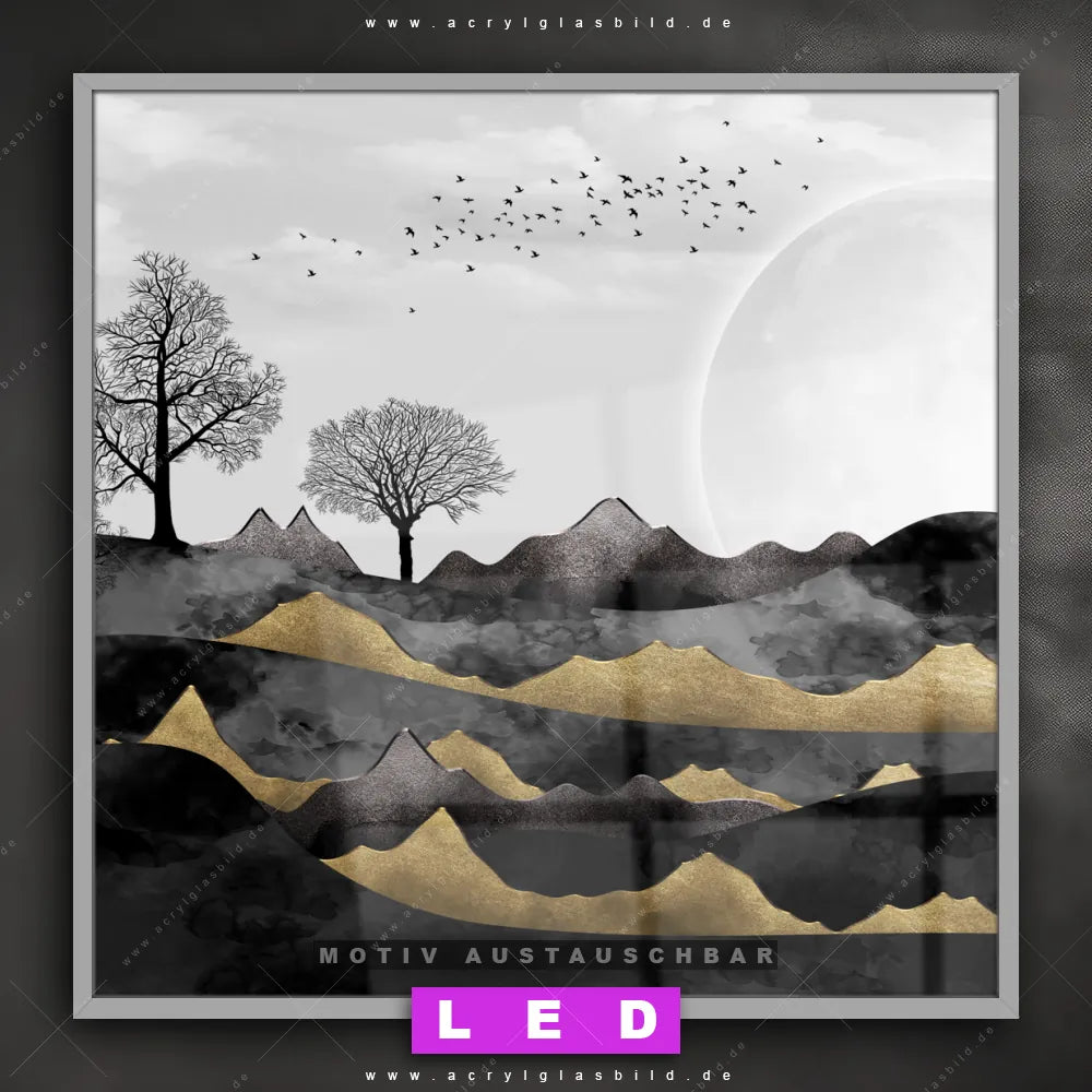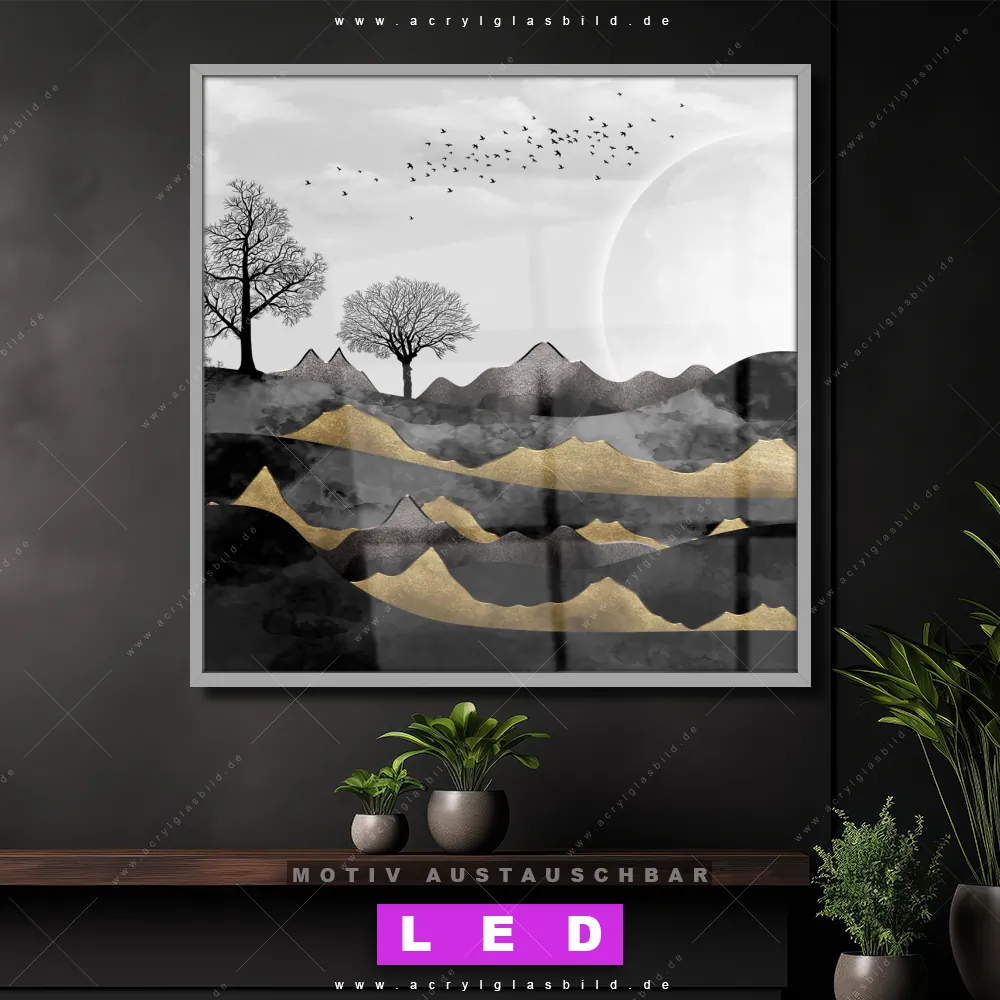 Vergiss dunkle Ecken und Langeweile! Mit unserem Acrylglasbild schwarz-goldene Landschaft und seiner brillanten LED-Ausleuchtung wirst du dich nie wieder in der Dunkelheit verirren. Wenn du auf der Suche nach einem beleuchteten Wandbild aus Acrylglas mit Abstrakt, Modern, Kunst, Landschaft, Bäume, Wald, Berge, Vögel bist, ist unser LED Acrylglasbild Canvalight® DIA Berge mit blattlosen Bäumen mit den strahlenden Motiv-Farben Weiss, Schwarz, Beige, Gold genau das richtige Leuchtbild für dich. Das im Abstrakt, Modern Art, Schwarz - Weiss Stil gestaltete LED Bild mit glänzender Front aus Acrylglas passt perfekt zu jedem Einrichtungsstil in Wohnzimmer - Schlafzimmer, Bar - Gastronomie, Arzt - Praxis, Büro - Kanzlei – vom minimalistischen Chic bis zum kreativen Chaos.
