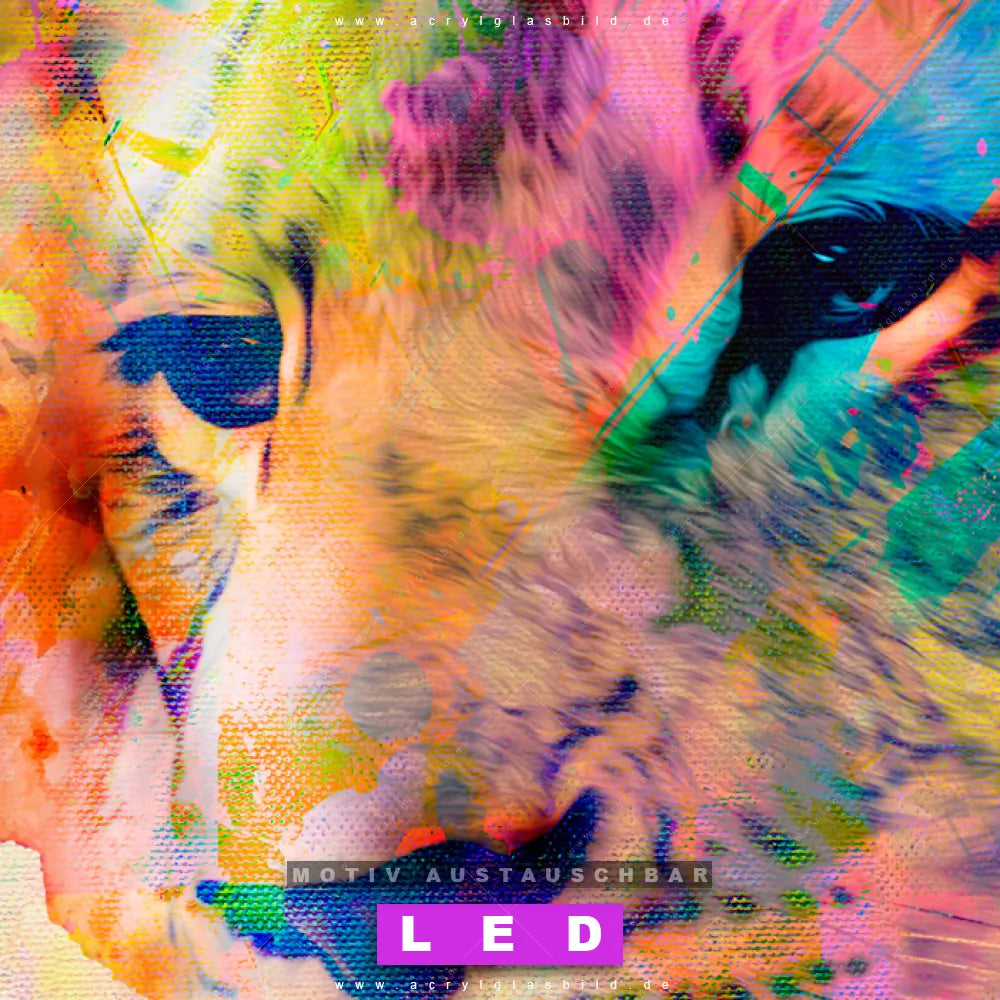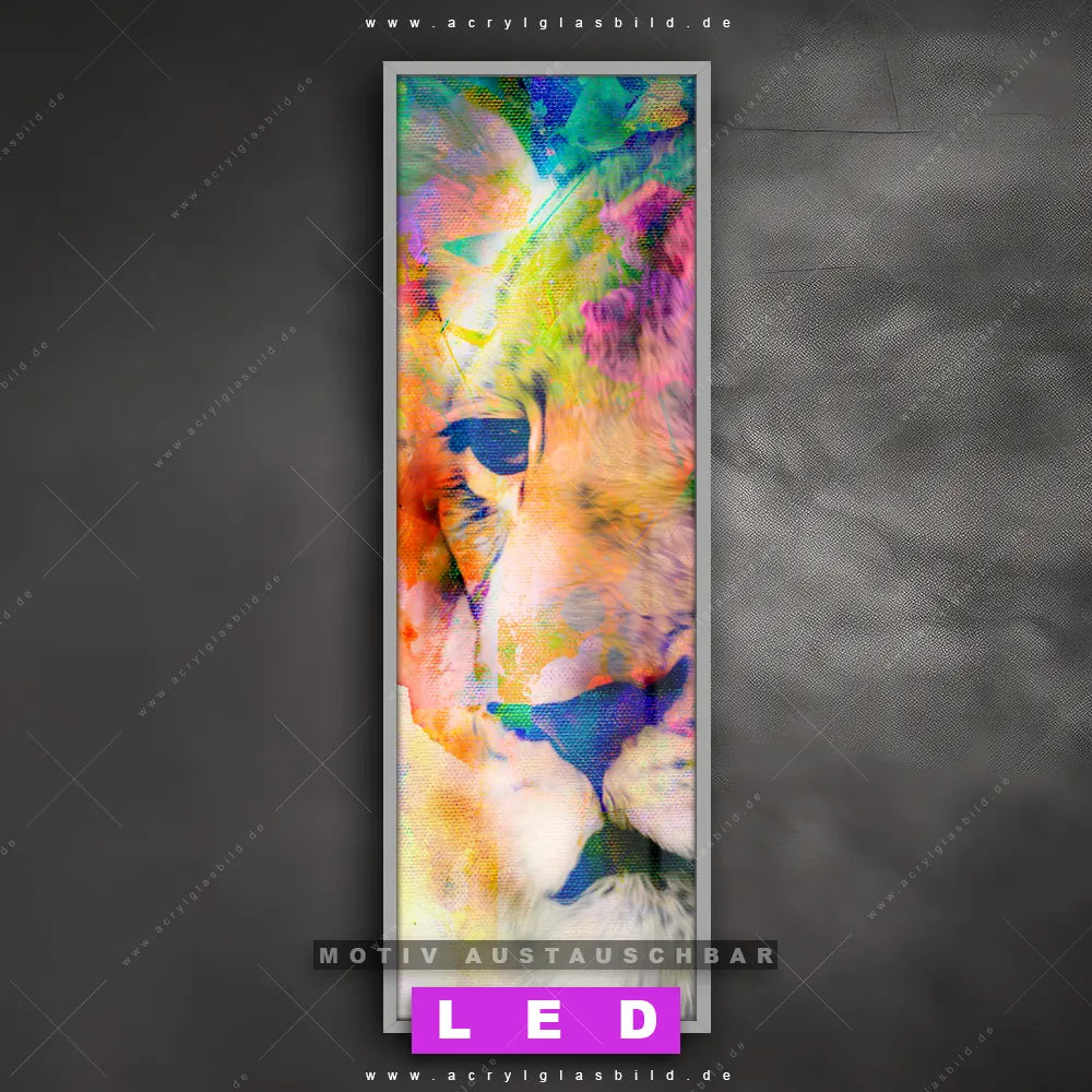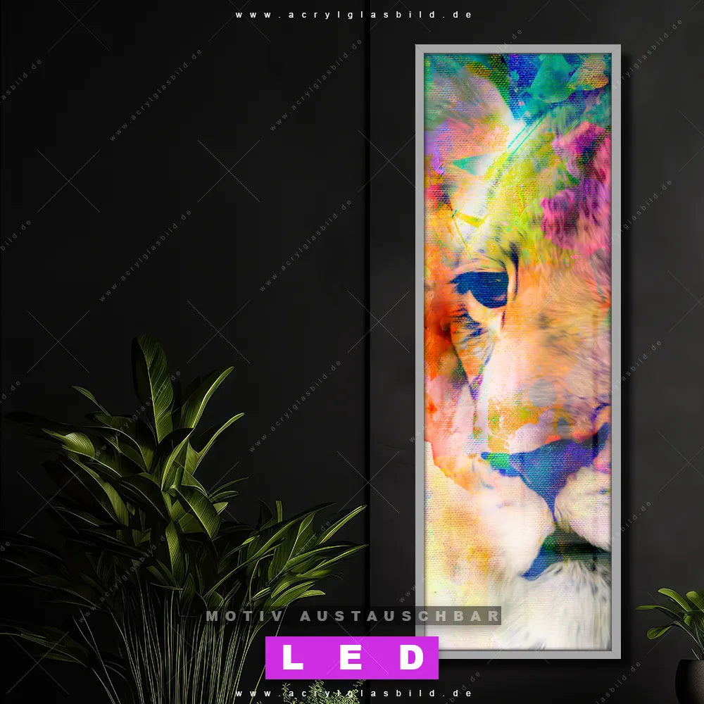 Bist du bereit, deine Wände mit einem dimmbaren LED Bild mit Fernbedienung und optionaler Farbtemperatursteuerung auf das nächste Level zu bringen? Unser Tierwelt Canvalight® DIA LED Acrylglasbild ist genau das, was du brauchst! Das Wandbild mit LED Beleuchtung im Schmalen Format mit austauschbarer bedruckter Acrylglas-Scheibe Abstrakte Löwin bringt Licht und Stil in dein Zuhause – und das in null Komma nichts!