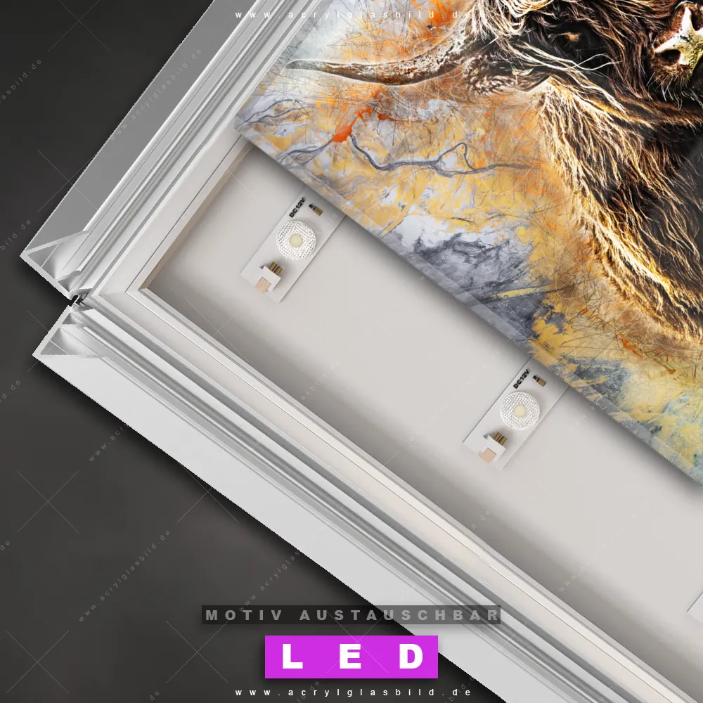 Also, worauf wartest du noch? Gib mit einem beleuchteten Wandbild mit wechselbarer Acrylglas-Scheibe deinen Wänden das gewisse Etwas und bestelle jetzt das LED Acrylglasbild Canvalight® DIA Schottisches Hochlandrind – dein Zuhause wird es dir danken und deine Freunde werden dank der wechselbaren Motive erblassen!