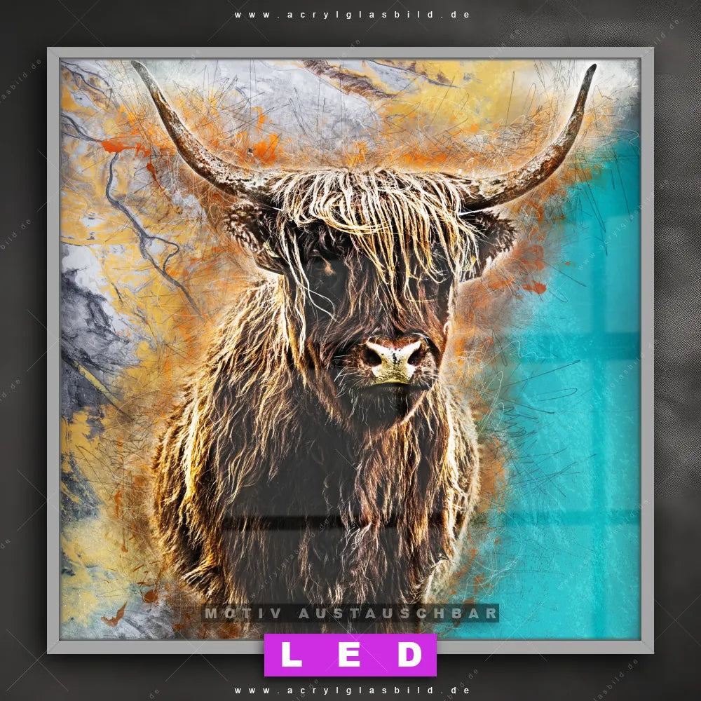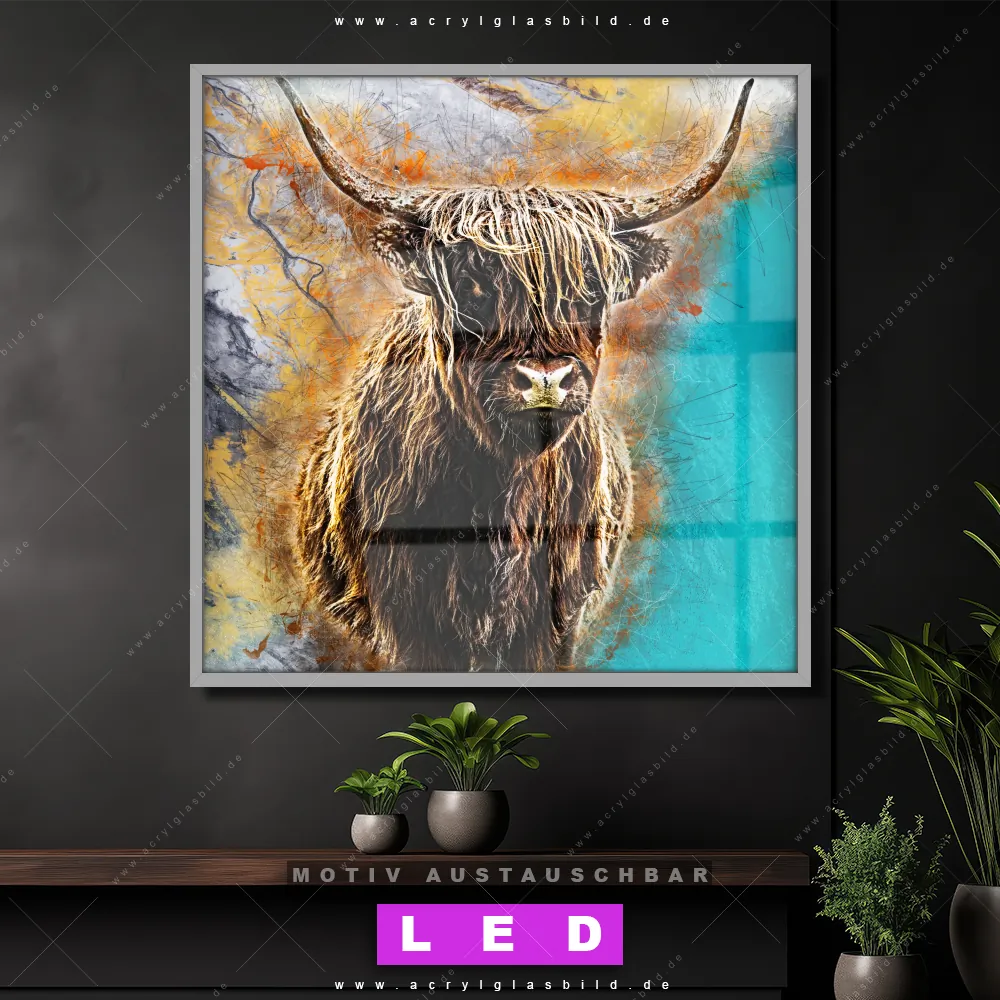 Bist du bereit, deine Wände mit einem dimmbaren LED Bild mit Fernbedienung und optionaler Farbtemperatursteuerung zum Leuchten zu bringen? Wir haben das ultimative Tierwelt LED Acrylglasbild Canvalight® DIA für dich! Unser LED Wandbild aus Acrylglas Abstrakter Highlander im Quadratischen Format mit austauschbarer bedruckter Acrylglas-Scheibe im DIA-Klapprahmen bringt sofort jede Menge Glanz in deine vier Wände.